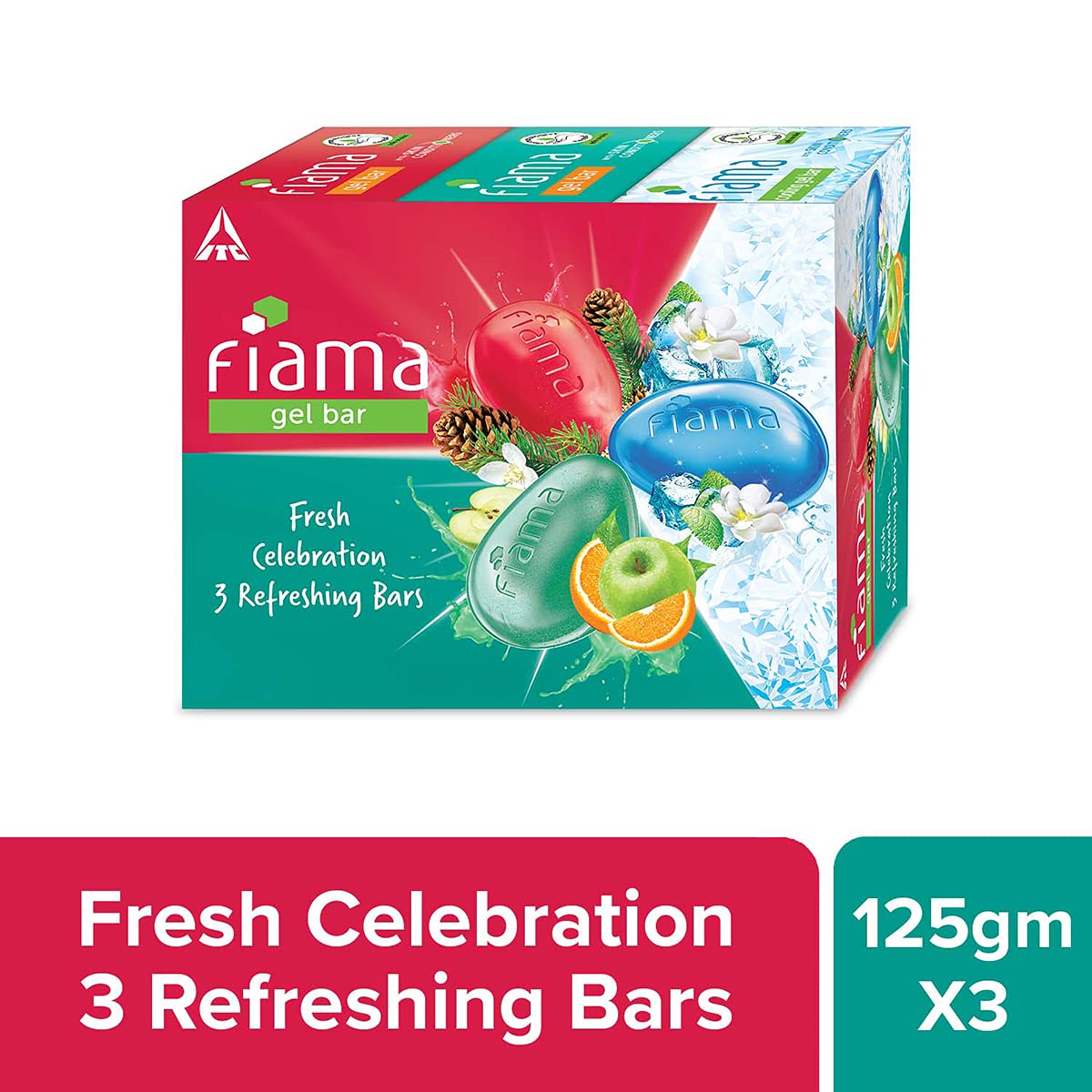 Gel Bar Celebration Pack, 125g Soap (Buy 4 Get 1 Free) & Fiama Gel Bathing Bar Fresh Celebration pack, with 3 unique gel bars, 125g soap (Pack of 3), Blue