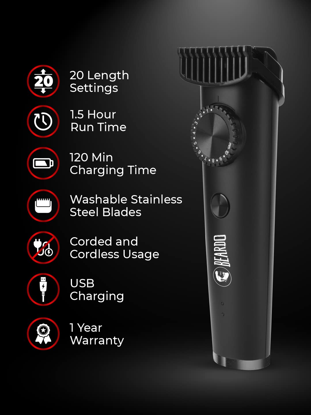 Beardo Don Trimmer for Men|90 min Run Time|20 Length Settings|Cordless|Washable Stainless Steel Blades|Powerful Li+ battery for quick charging|Stylish Gun Metal finish