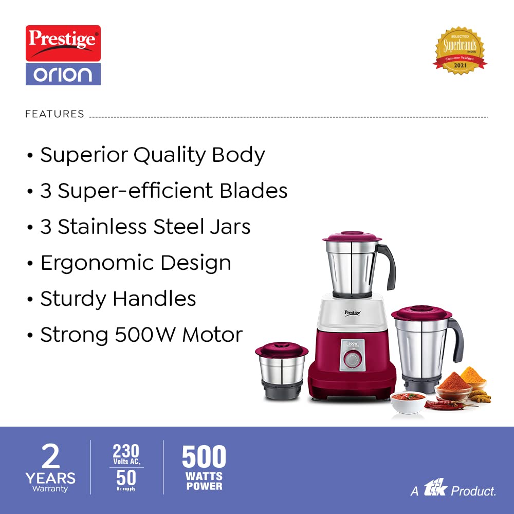 Prestige Orion 500 Watts Mixer Grinder with 3 Stainless Steel Jars (1200ml, 1000ml, 500ml,Red)