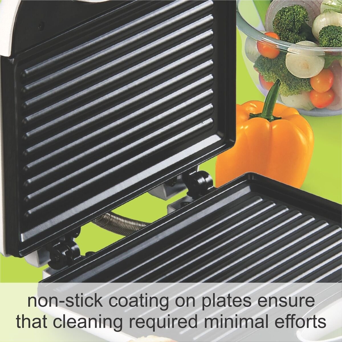 • Special Feature: Cool touch handle, light indicators; Power 750 Grill Sandwich maker; Pressing lock system; Non-stick plates; Vertical stacking; Thermostat control for even cooking