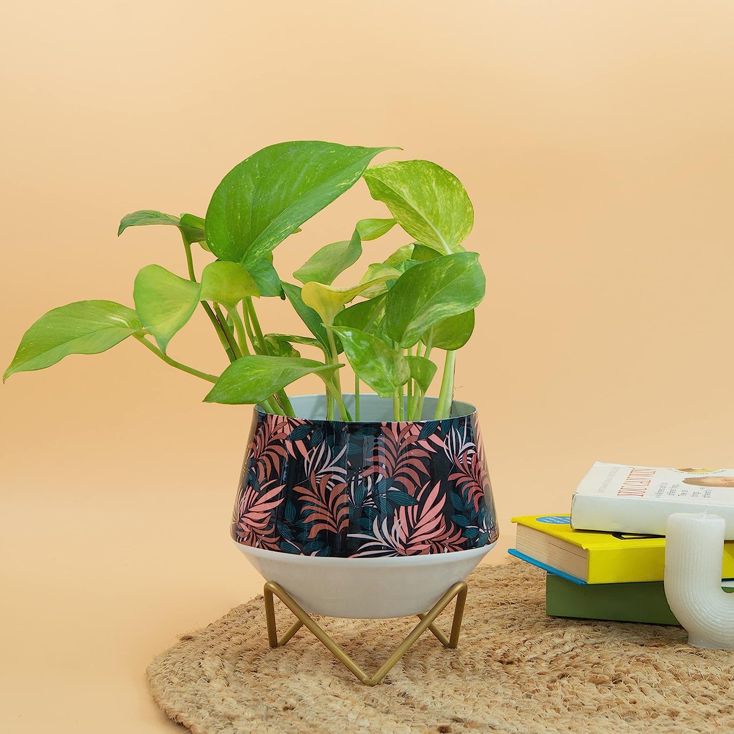 Kyari Metal Round Tropical Modern Design Pot with Stand | Multicolour | Dimensions: 14.5 x 12.5 cm (HxD) | Indoor Decor | Rust-Free Powder Coated Metal | Plants Not Included