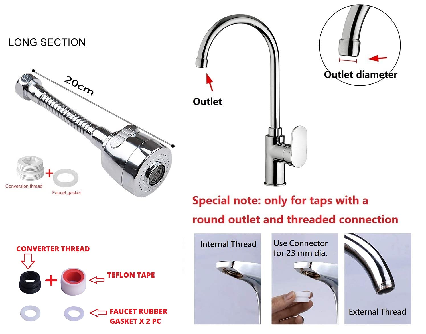 • Important Note : Do not use this product if water pressure is too high, Specially in Hight Rise Towers. Use Teflon Tape on Every threads while connecting to Any Tapes. This Product is Designed for Specific Taps kindly check in Images which types will be compatible.