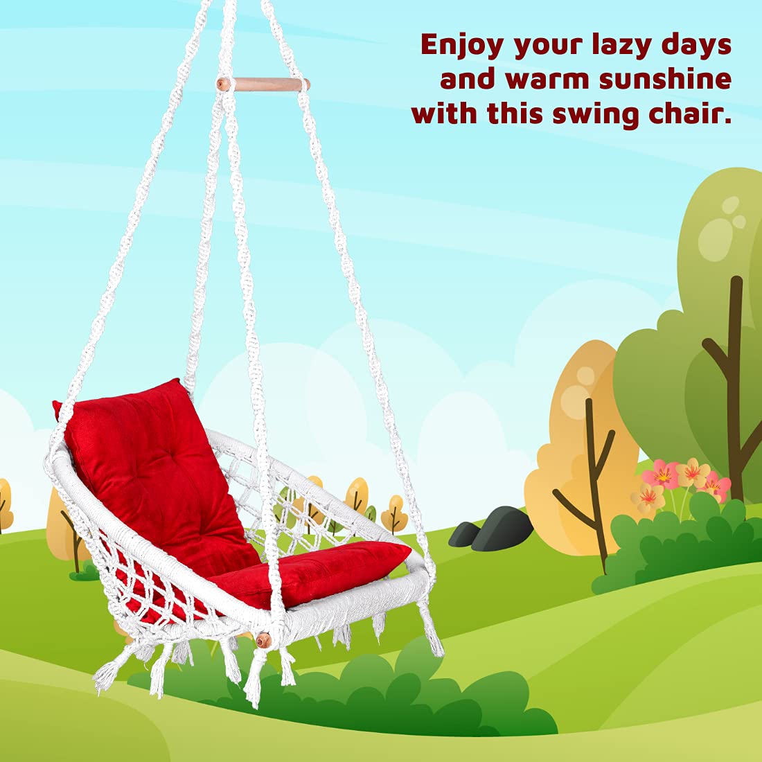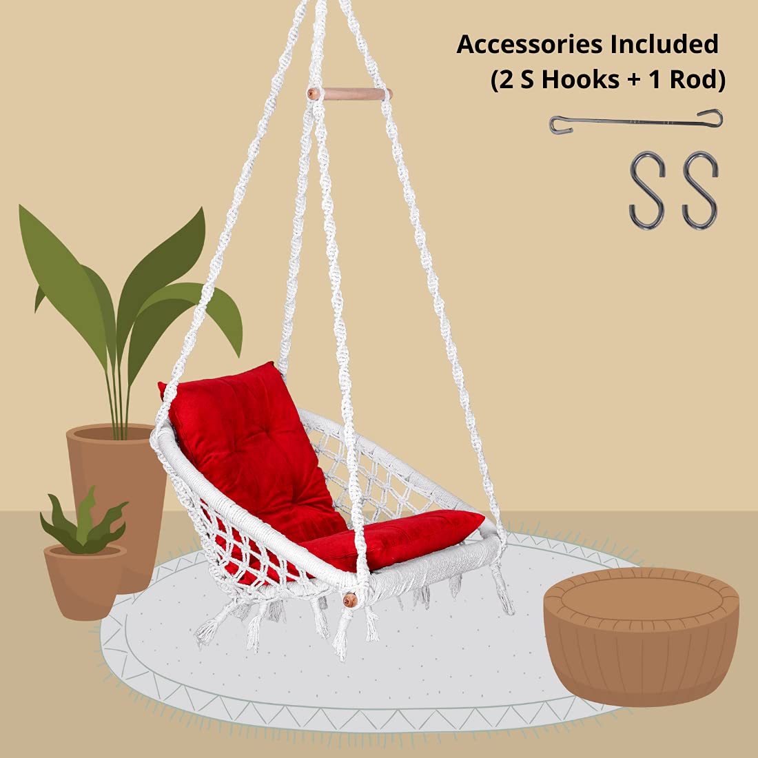 • Quality Assurance: This stylish, whimsical D-shaped hammock chair is made from 100% hand-woven cotton on a sturdy frame to enhance its robustness to ensure they are not torn or damaged. This hanging chair swing also includes one L Shape cushion. This swing chair is lightweight, free to move, Very safe, suitable for adults and children and comes with 2 'S' hooks, and 1 rod and 1 Cushion.