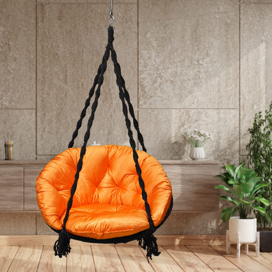 Jhula for Adults/Swing for Adults for Home/Swing for Balcony/Swing for Adult/Swing for Living Room/Jhula/Hammock Hanging Premium Cotton Round Swing Chair with Large Orange Sitting Cushion(Black)