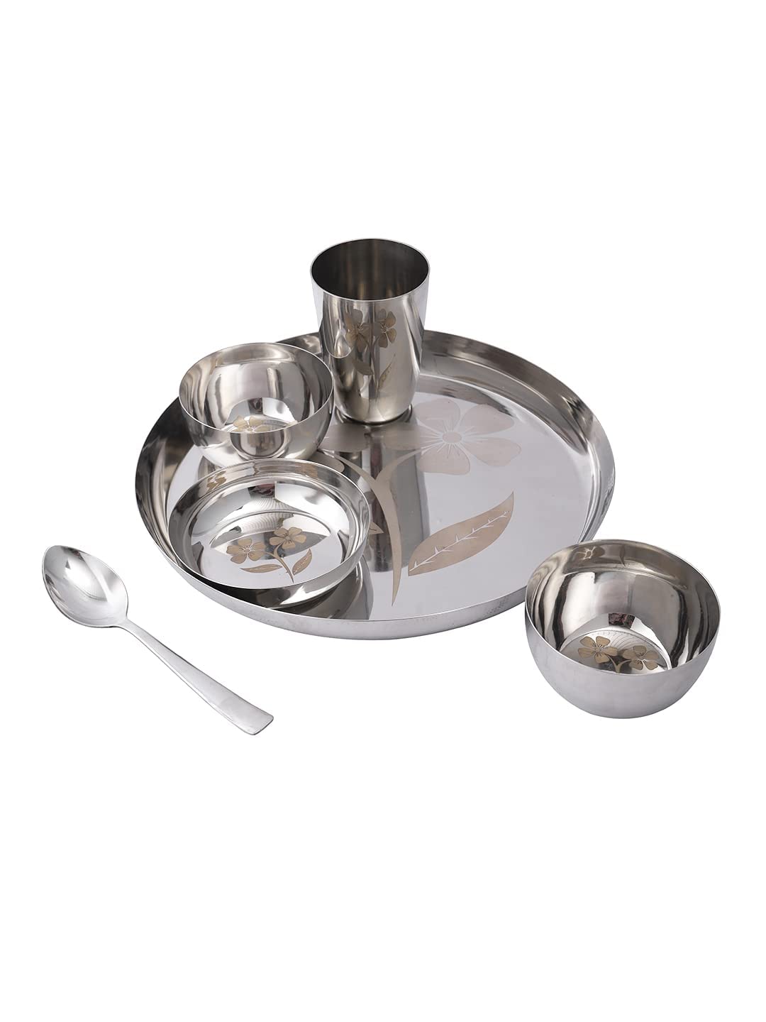 Prime Stainless Steel Heavy Guage Material Dinner Set | Dinner Set with 3 Thali, 6 Bowl, 3 halwa Plate, 3 Glass, 3 Spoon | Dinnerware | Stainless Steel Dinner with Set of 18 | Silver |
