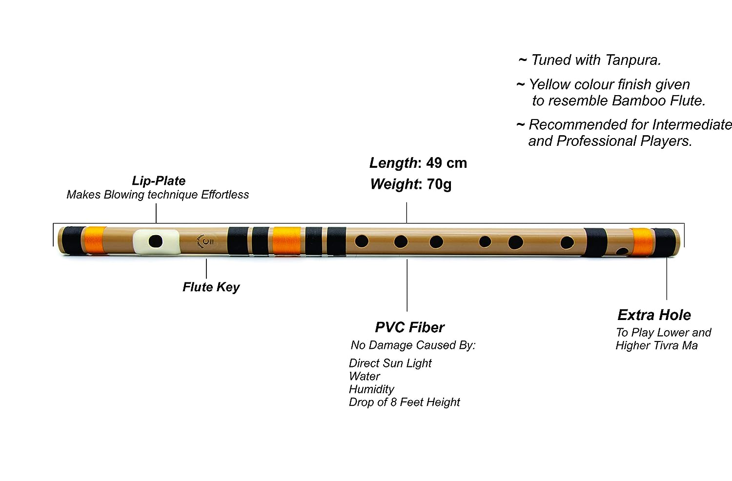 • Yellow colour finish- Gives resemblance to Bamboo Bansuri.
