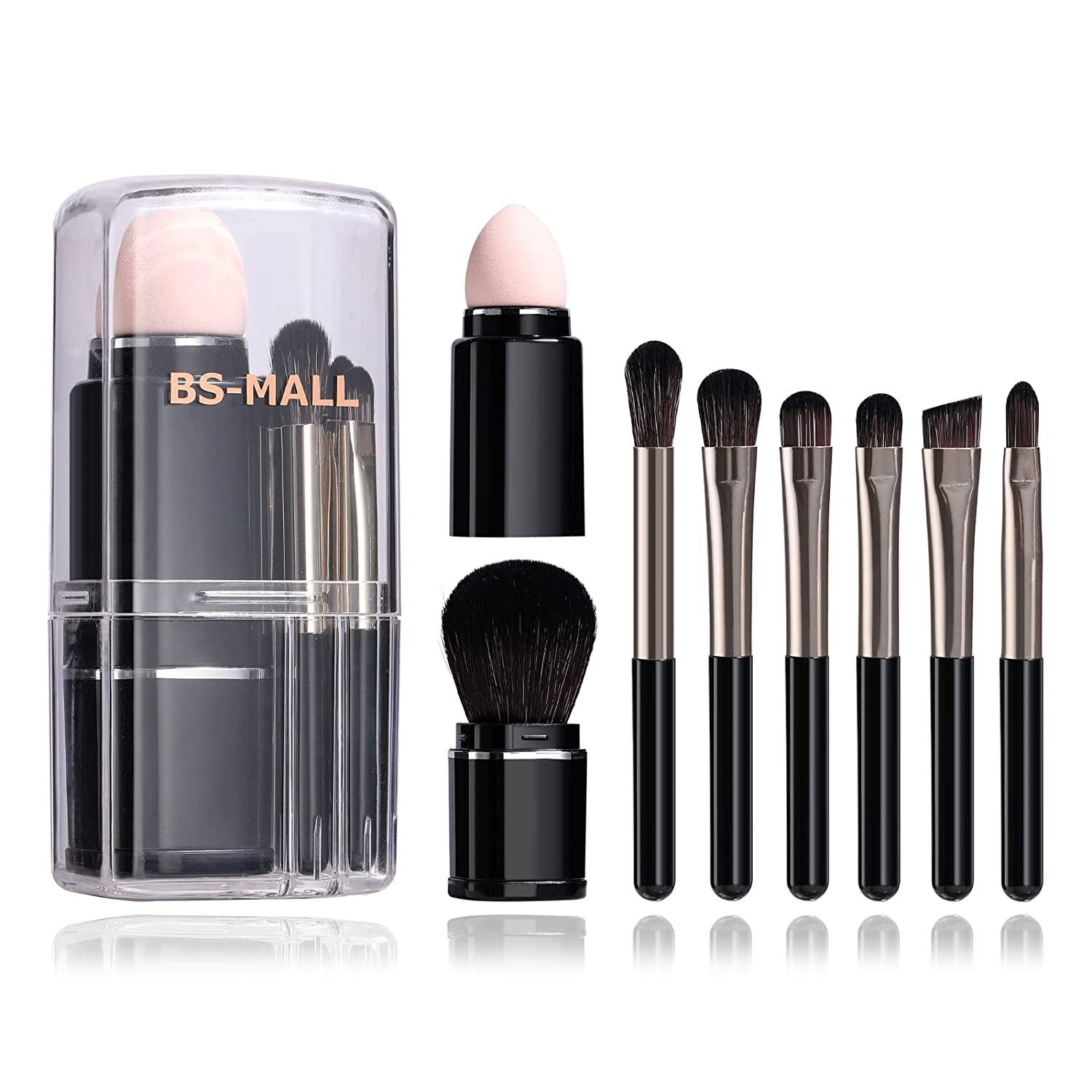 - ★ SMALL BLACK MAKEUP BRUSH SETS : 8-in-1 set of essential face brushes to help achieve a full-face look, all in a small glossy see-through case. 4 pieces face makeup brushes: loose powder brush, contouring brush, basic smudge brush, concealer brushes, 2 pieces eye makeup brushes : eyeshadow brush, angled brush, 1 lip brush, 1 beauty sponge.