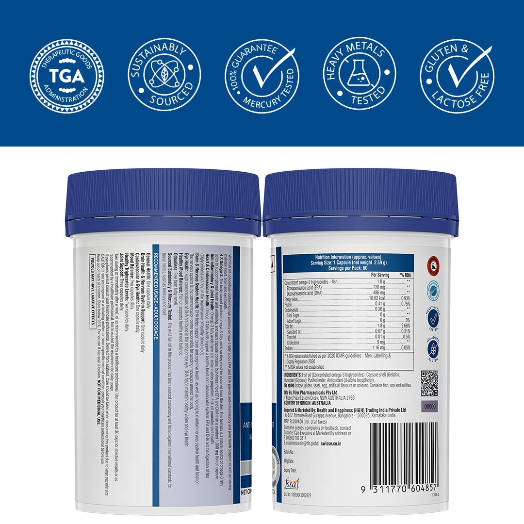 Swisse 4X Strength Fish Oil (1800mg Omega 3 In Single Capsule) Highest Fish Oil Strength - Recommended For Gym Goers & Active Individuals, 60 Capsules (1 Capsule Per Serving)