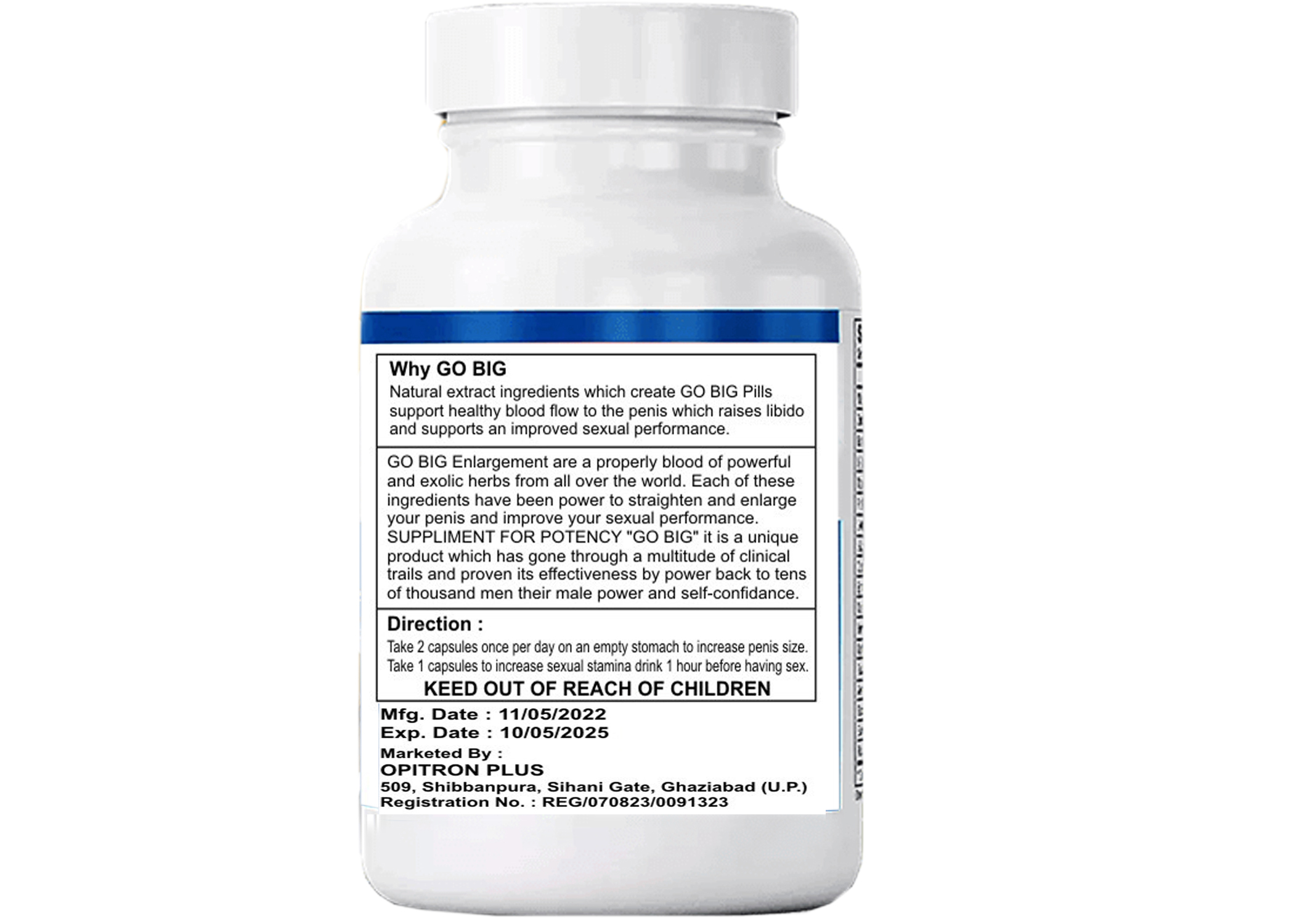 Opitron Plus Go big is a food supplement famous to increase the penis length and girth/width. This sex supplement also increases the erection of penis by strengthening the penis. Due to dilation of penis cavity tissues swell well and enlarge the male sex part. Good thing about this sex product is, it remain effective even after taking the capsules.