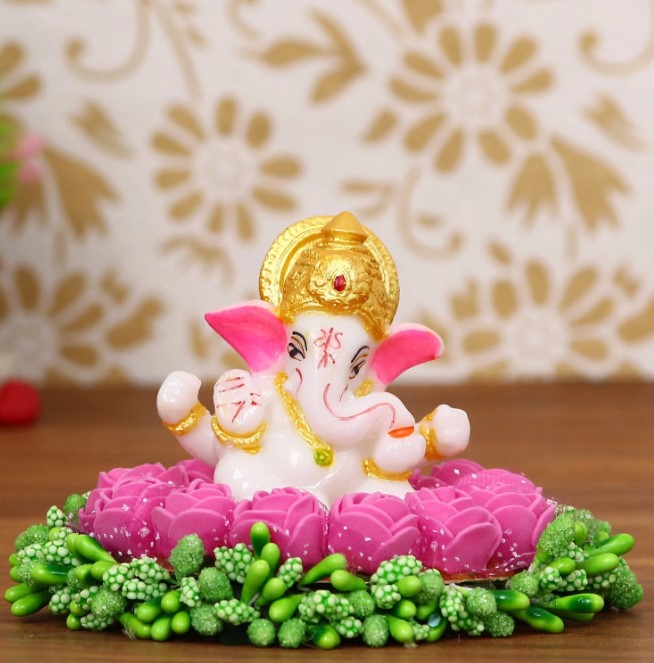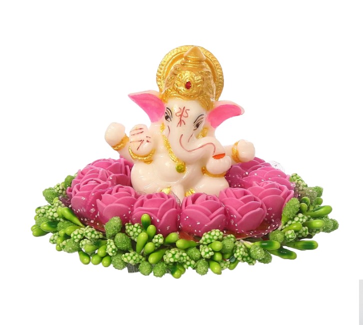 Package Content - One Lord Ganesha Idol on Decorative Handcrafted Plate with Pink Flowers