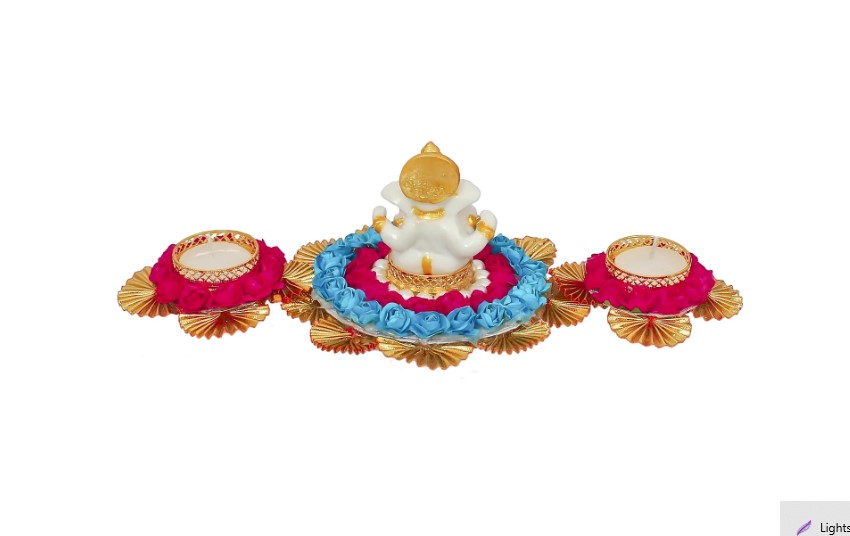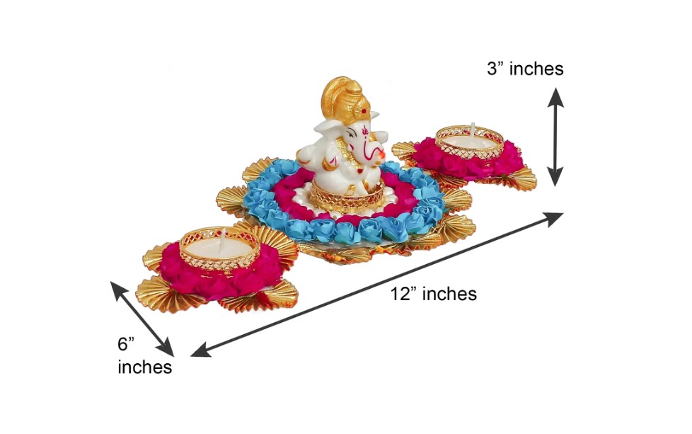 Package Content - One Lord Ganesha Idol on Decorative Plate with 2 Tea Light Holders