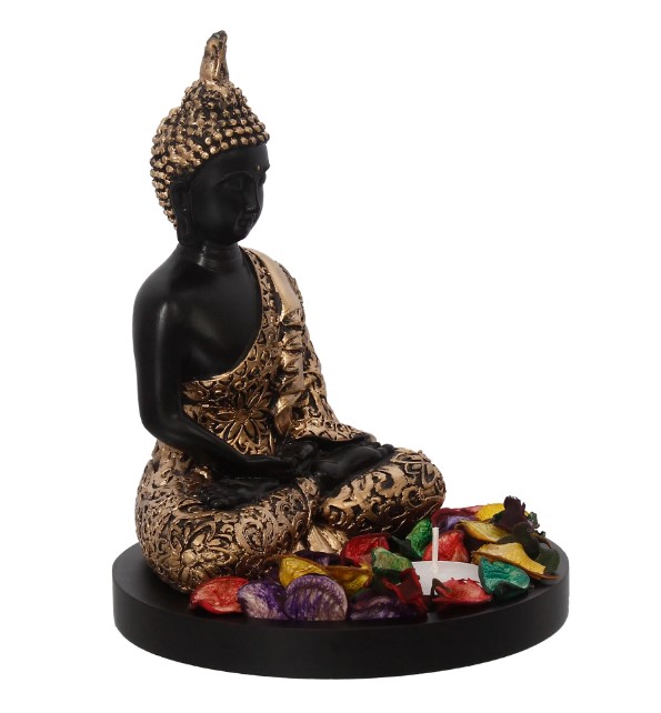 Product Description - Bring home spirituality and good vibes with Lord Buddha idols. Buddha idols are known to be lucky for the person who holds them in their home or at the office. Handcrafted using various ancient methods by the artisans at the house of Faverdeal, this golden & black meditating Buddha figurine with wooden base, fragranced petals & tealight arrives with in golden & black color with fragranced petals & tealight making it as the best gift option for your friends and family. You can bring spirituality into your home by even bringing in the other unique idols & figurines that you will find on our online portal. Exquisitely designed and intricately crafted, it makes for a perfect gifting option. This showpiece is handcrafted intricately by our skilled artisans. You can find many more god idols and figurines in different avatars on our online portal in various colors that suit your home or office interior.