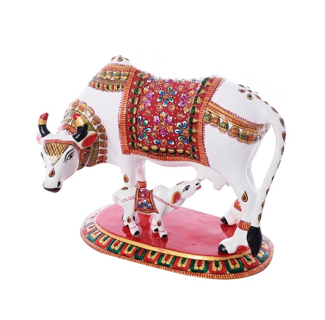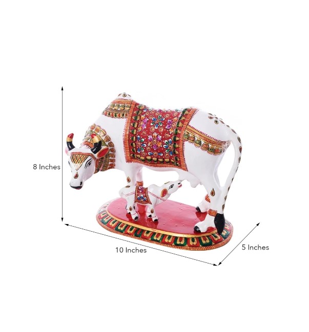 Product Description - The unique creation of meenakari metal white, green and red Kamdhenu cow & calf is an amazing symbol of holyness and culture that has been followed for years now. This figurine showcases the motherly figure of the cow that communicates the sentiments of people with Gaumata. These figurines are the most loved home decoration items that people adore to decorate their home with and also their puja ghar. This can also be a great gift option when you visit your relative's place for a religious function or even for a house warming celebration. These creations are made by experienced artisans at the home of using several antique methods.