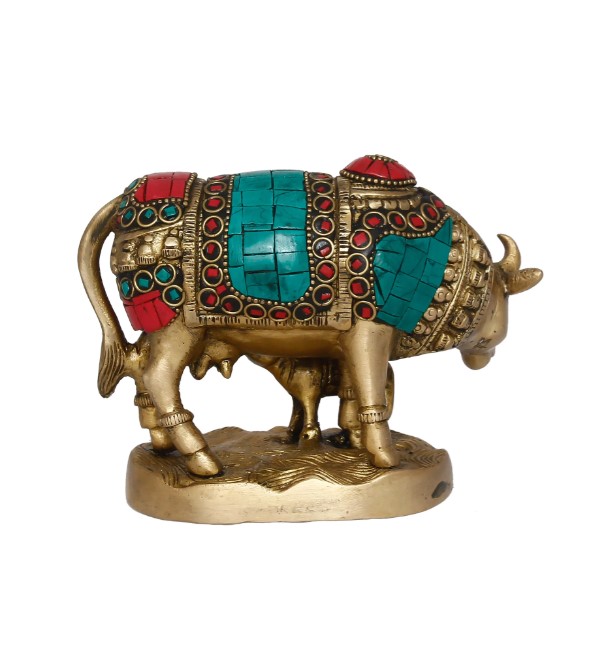 Package Content - One Cow and Calf Handcrafted Brass Idol Figurine with Colorful Stone Work