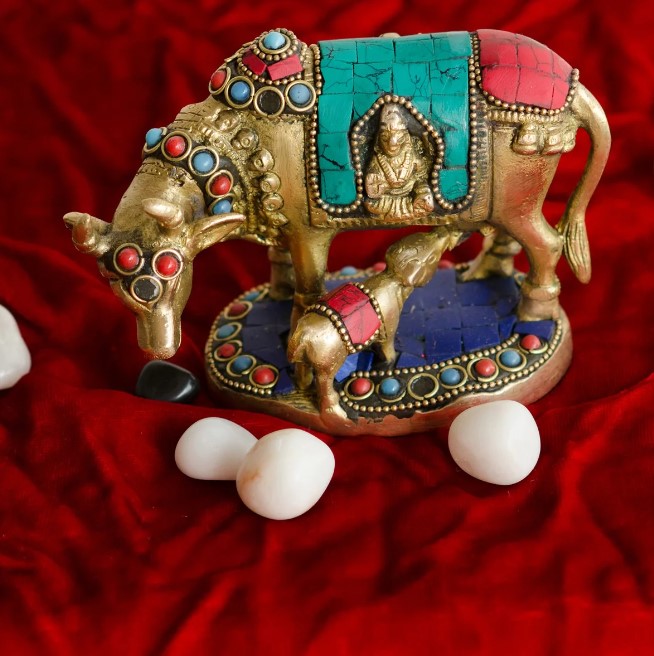 Product Description - Beautiful creation of kamdhenu cow & calf is a perfect symbol of the undying aura of the holy saint that encompasses numerous devotees round the globe. This statue aptly conveys the emotions of people who consider cow (gomatha) as a motherly figure. Kamdhenu cow & calf statues are widely used for decoration purposes in homes and offices. It serves as a great gift, especially around religious celebrations and festivities. This brass handicraft has been made by skilled artisans from the house of using various traditional techniques.