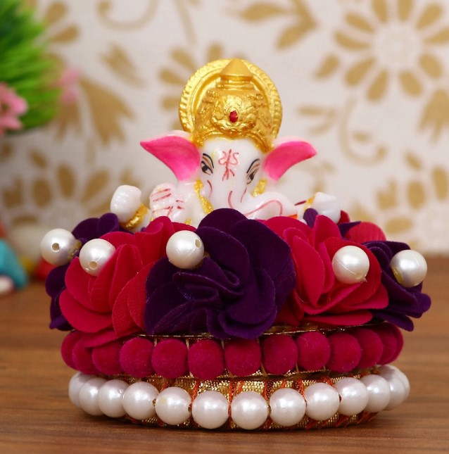 Package Content - One Lord Ganesha Idol on Decorative Handcrafted Plate with Red and Purple Flowers