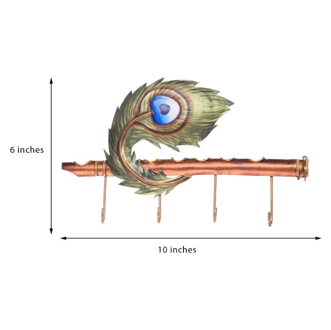 Product Description - Are you a Lord Krishna believer? Or wish to have traditional things as your home décor? Our Green & brown Wrought iron bansuri with mor pankh Key Holder with 4 Hooks is the best for you to have in your home. It is necessary to have a good kind of key holder to hang your keys as this home décor item should be of good long-lasting usage as well as should embrace, and enhance your home interior. This key holder comes in Green & brown colors. This is completely handcrafted using various inherited techniques by the artisans at the house.