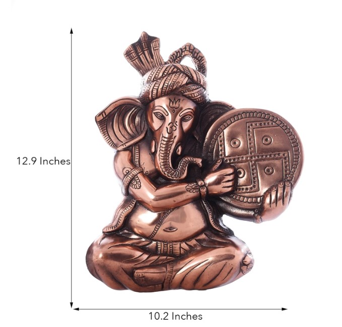Product Description - Lord Ganesha is said to bring good luck and prosperity into your lives. Wondering what to buy as a gift for a dear friend who has recently purchased a new home? Why not consider our Lord Ganesha wall hanging, made using high-quality brass? The Ganesha in this wall hanging brings a sense of whimsy to your interiors because he sits in the garb of a musician, lost in the music being created by his daily. Our Brown Phagdi Lord Ganesha Tambourine/Dafli musical metal wall hanging" is the best showpiece that comes in brown color. This art piece surely grabs attention in your living room. Religious wall décor has always been preferred by many and it also stands as a great gifting option for your friends and family. It serves as a great gift, especially around religious celebrations and festivities. Each religious wall hanging is diligently handcrafted by skilled artisans from the house of using various traditional techniques.