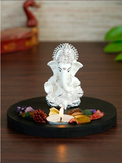 Package Content - One Silver Plated White Siddhivinayak Ganesha Decorative Showpiece with Wooden Base, Fragranced Petals and Tealight