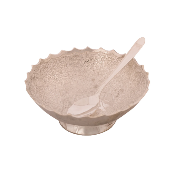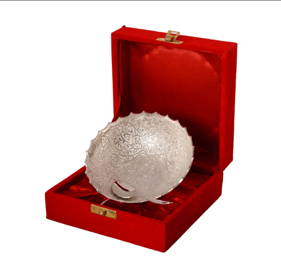 Product Description - To create a royal appearance for your dinner table, offers you this lovely German Silver Decorative Platter coupled with a Royal Velvet box. German Silver products have been in trend for ages now when it comes to gifting your friends & family as they can be viewed as a lovely and sophisticated gift for any occasion. This gorgeous platter has been painstakingly made by hand by talented craftsmen from the company utilizing a variety of age-old methods. Select from our range of German Silver products and make your celebrations even more regal and grand.