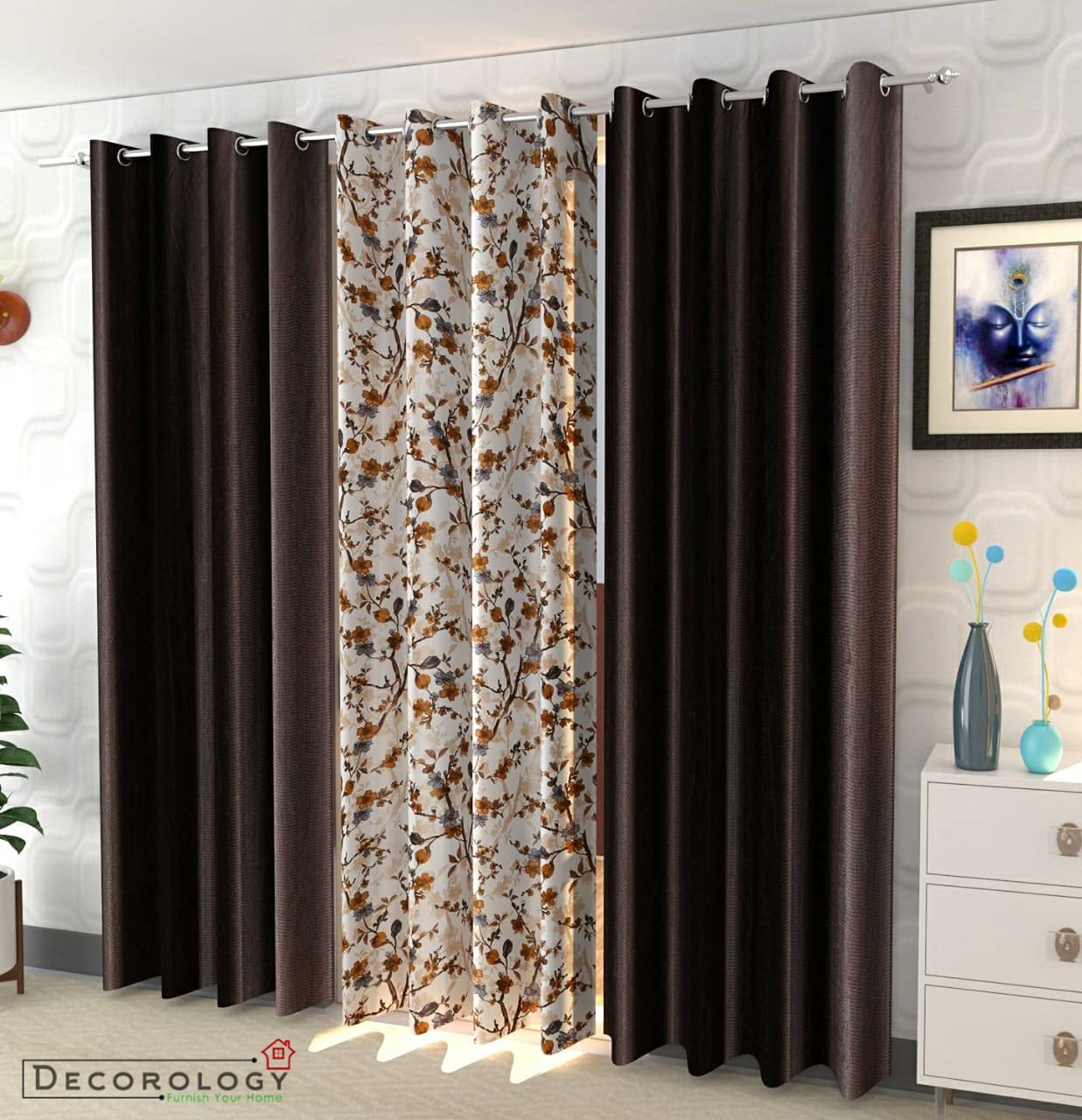 Plain Solid And Floral 3D Digital Printed Heavy Long Crush Polyester Fabric Eyelets Curtains , Combo Of 3 , For Living Room & Bedroom ( Set Of 3 ) (Coffee, 4 Feet X 7 Feet)(Eyelet;Blackout)