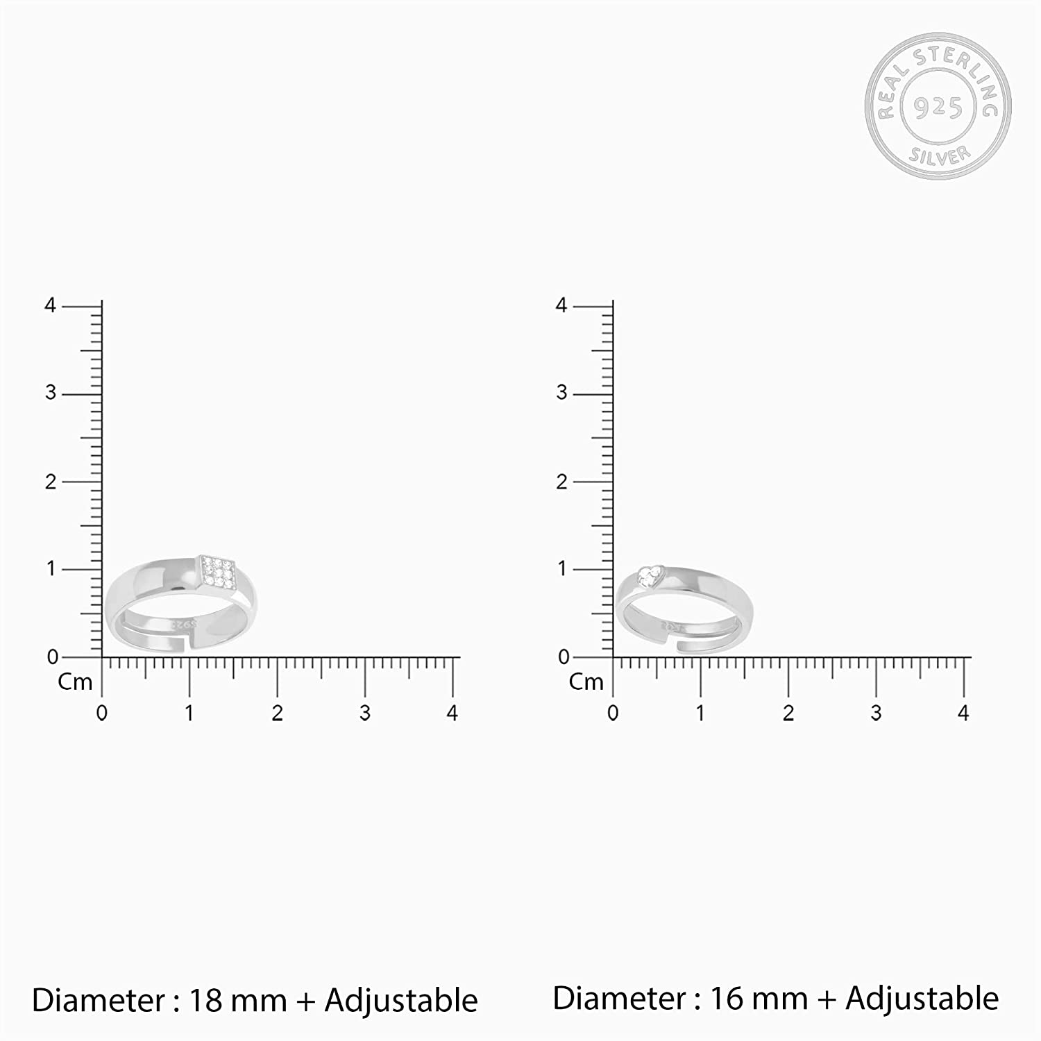 - PRODUCT DETAILS: Made of 925 Sterling Silver, Adjustable size to ensure no fitting issues. Male Ring: 18 mm+ Adjustable, Female Ring: 16 mm+ Adjustable. Rhodium finish to prevent tarnish