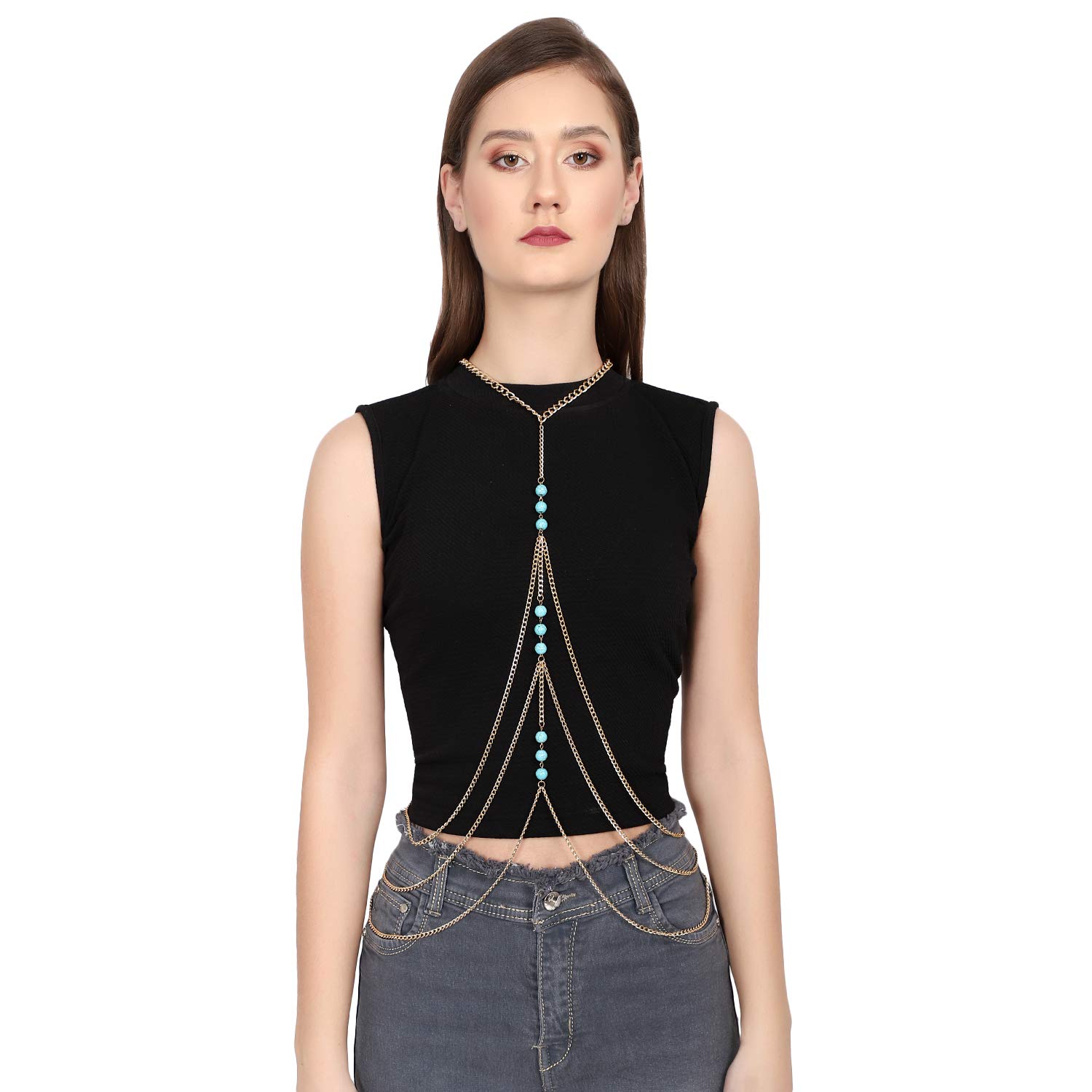 Multi Shoulder Heavy Blue Beaded Gold Party Body Necklace Chain for Women