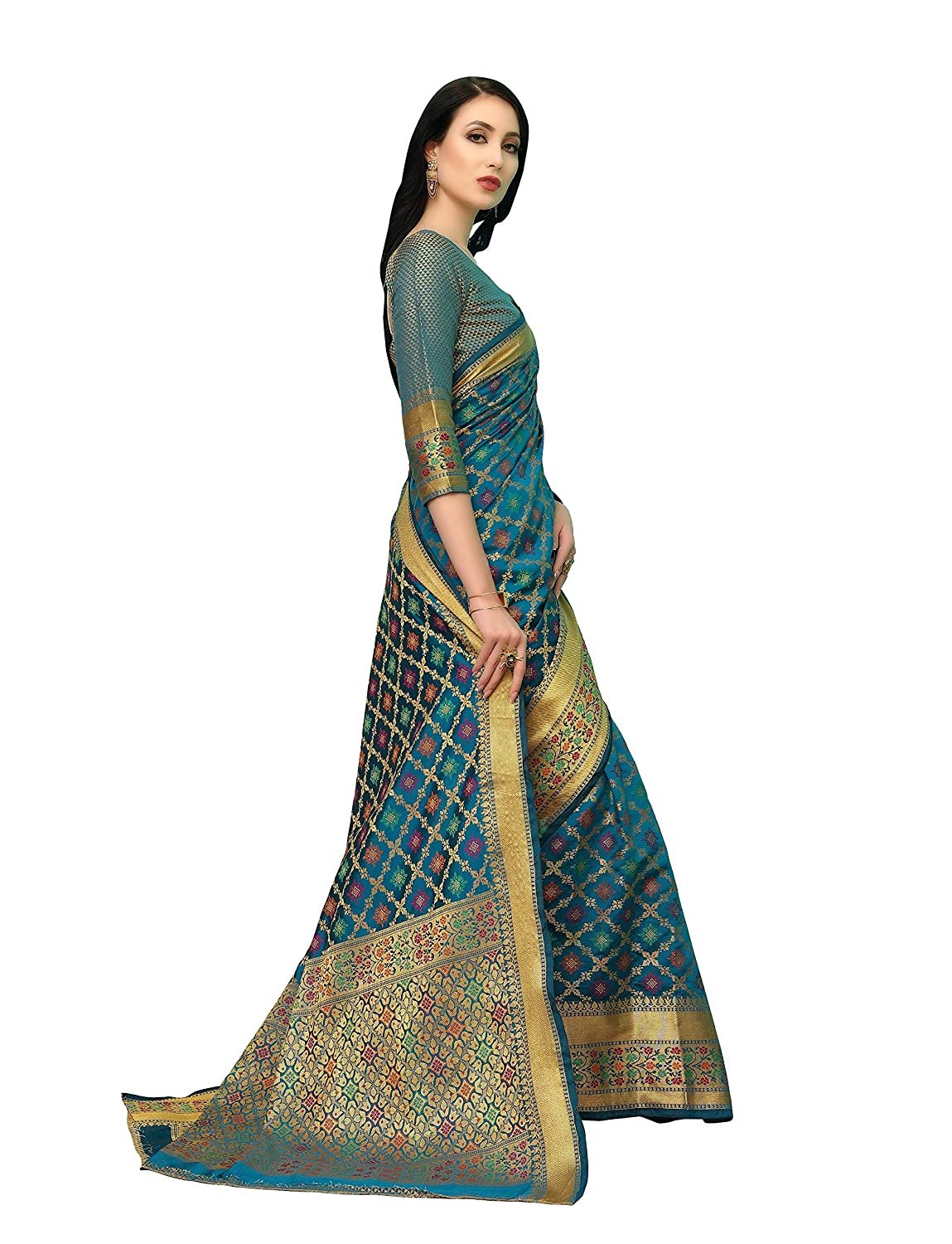 • Material : Banarasi Art Silk || Color : Sky Blue || Type: Kanjivaram Jacquard Silk || Golden Zari Work