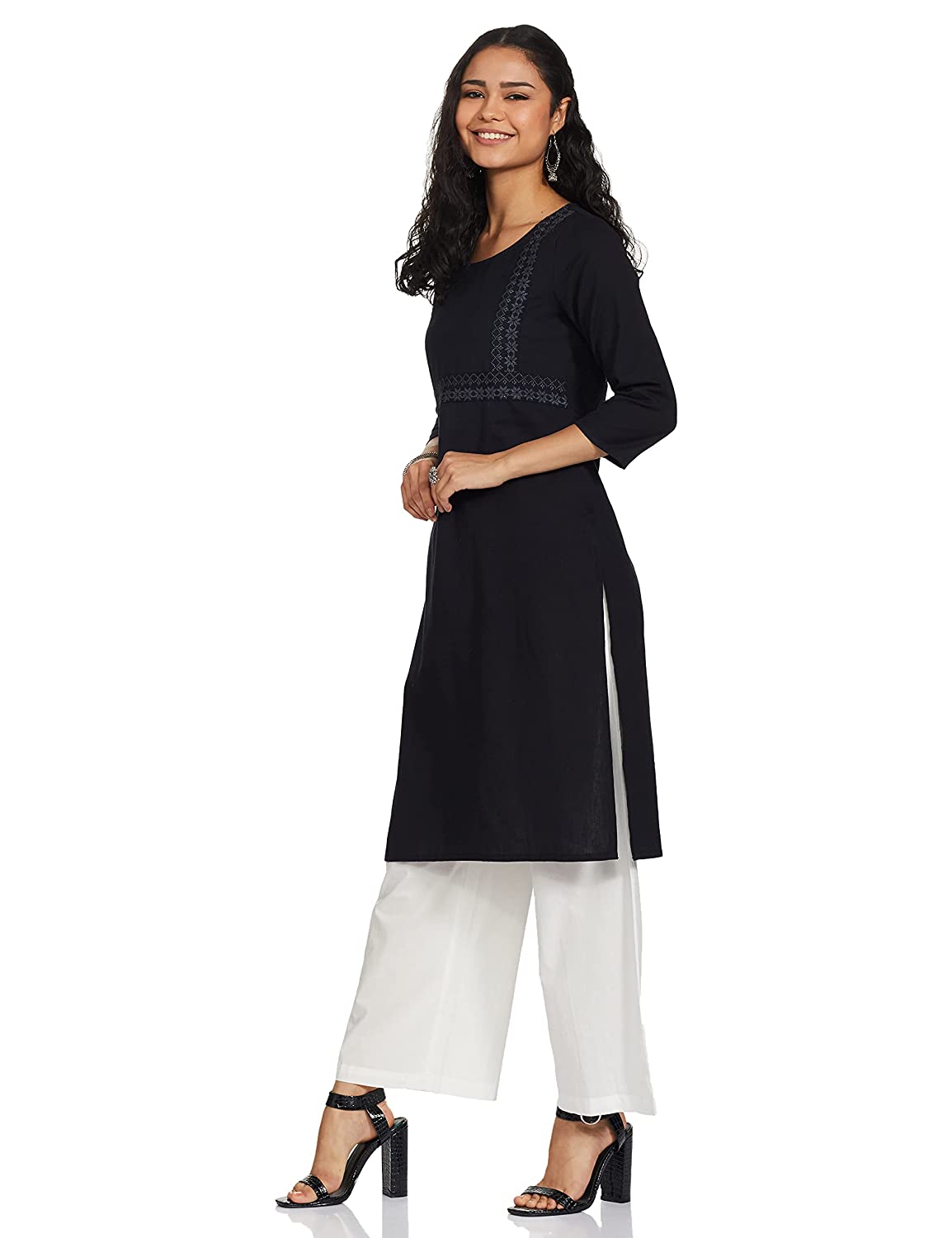 • Kurta Palazzo Set : Exquisitely embroidered Cotton Flax Straight fit Kurta with round neck, 3/4th sleeves paired with Cotton Cambric relaxed fit palazzos with elasticated waistband
