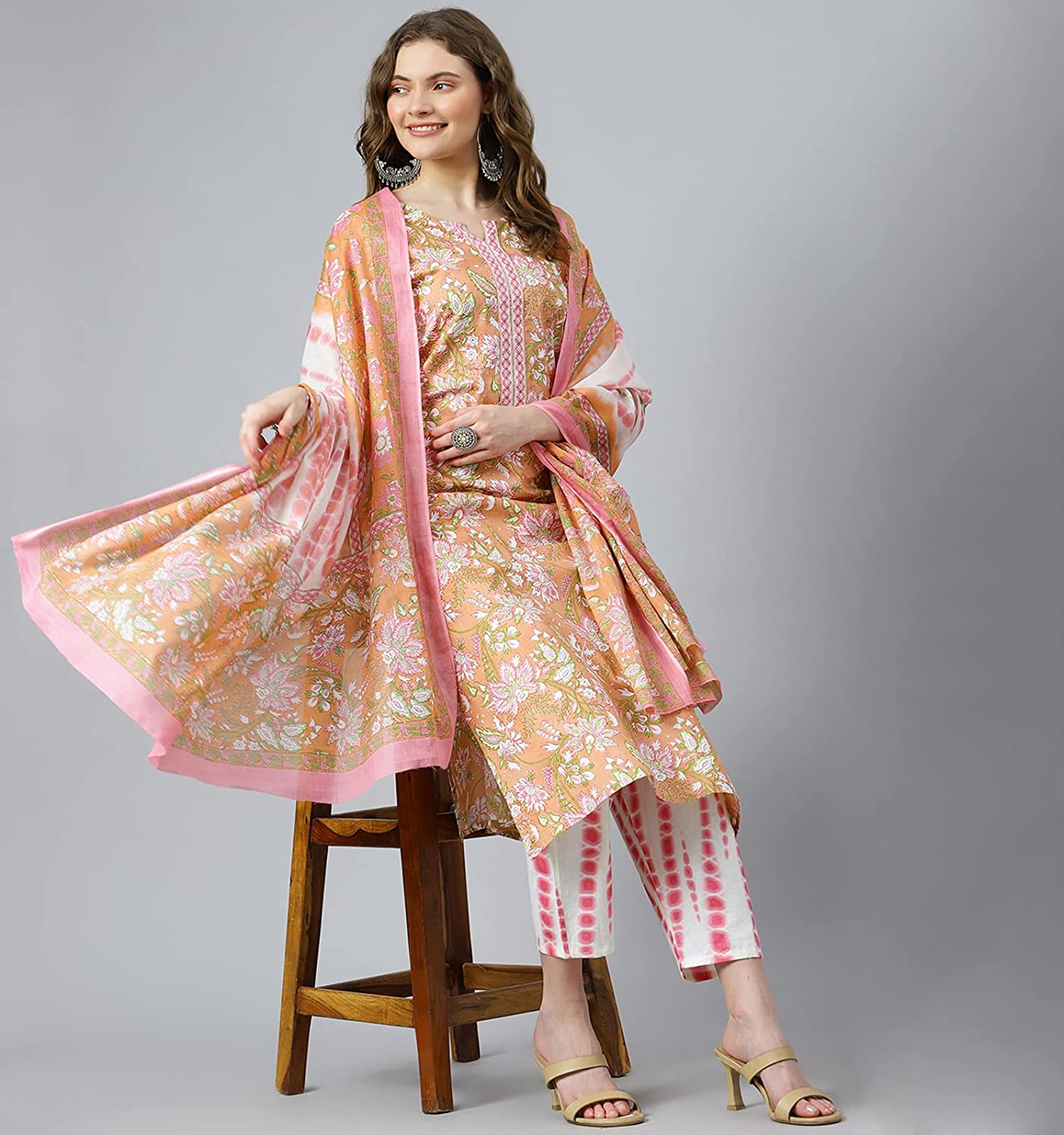 Cotton Readymade Salwar Suit Set. Printed Straight Kurti Pant Dupatta Set Latest