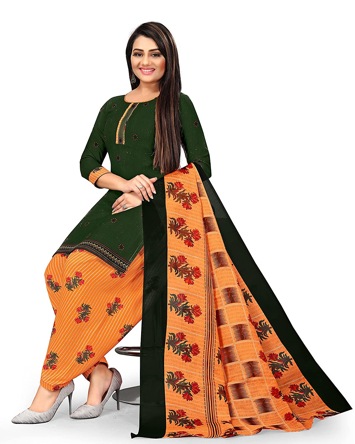 - Color :: Top - Green , Bottom - Orange , Dupatta - Orange