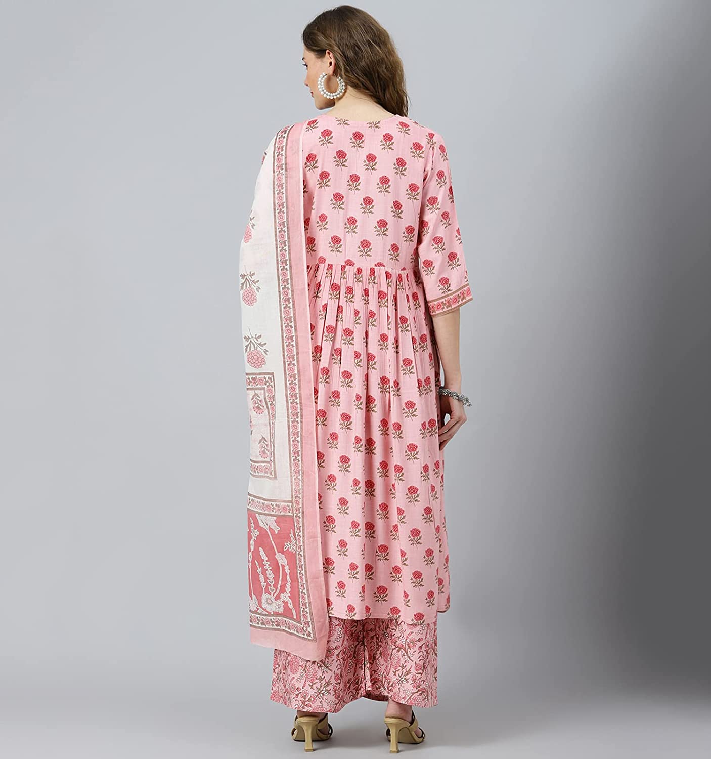 - Type : full stitched || style : jaipuri printed Anarkali/Flared/Umberella kurti with salwar and cotton dupatta|| Length : Calf Length || Sleeves : Three-Quarter Sleeves