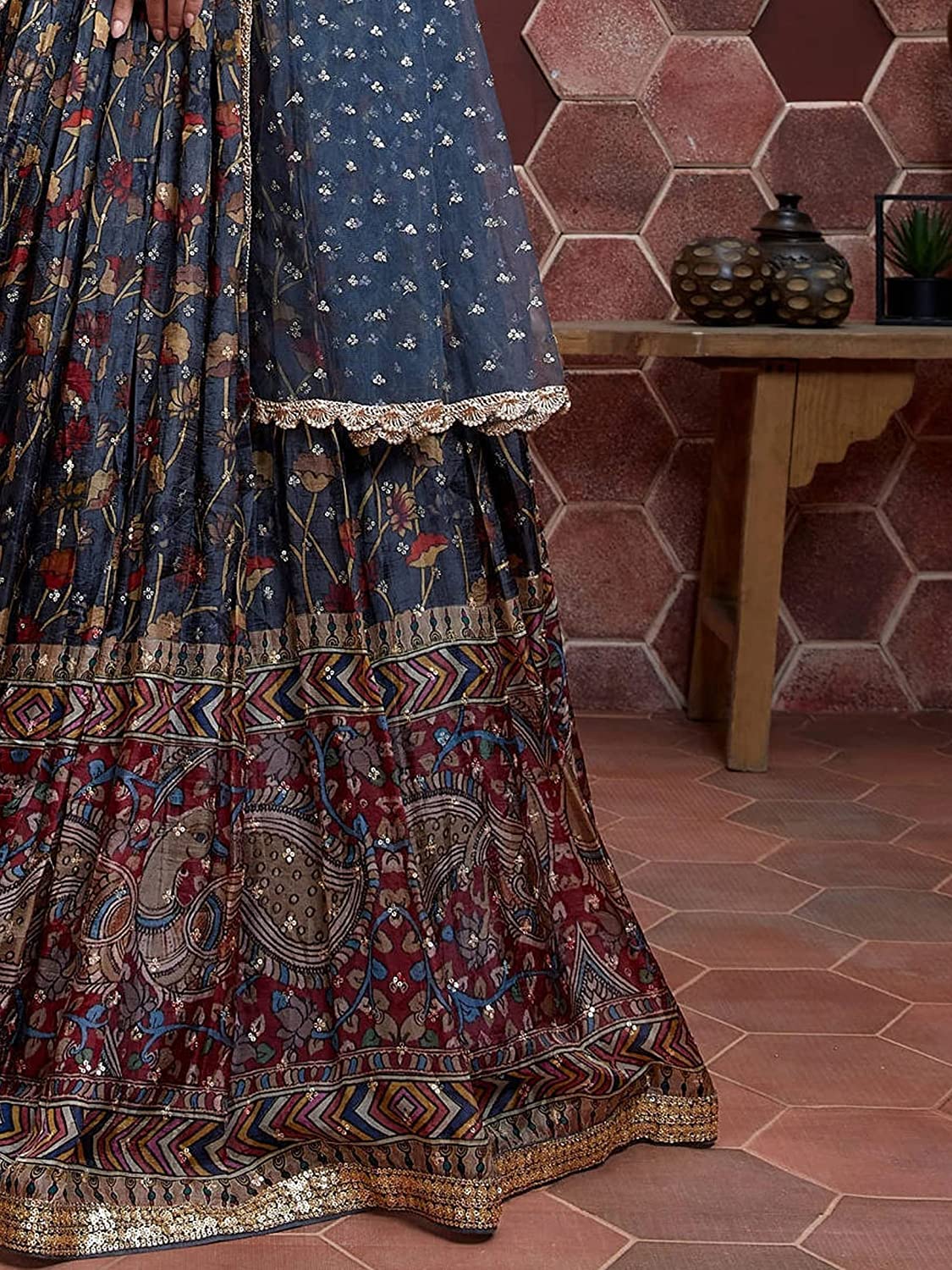- Lehenga Work: Digital Print with Zari & Sequins Embroidery; Blouse Work: Dori, Zari & Sequins Embroidery with Real Mirror Work; Dupatta Work: Sequins Embroidery with Pearl Lace