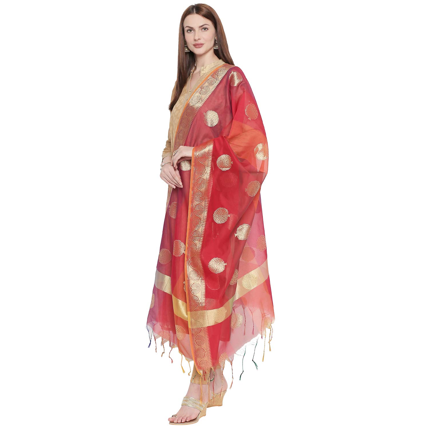 - This silk dupatta is a stunning melange of vibrant hues adorned with woven gold motifs and delicate tassels.
