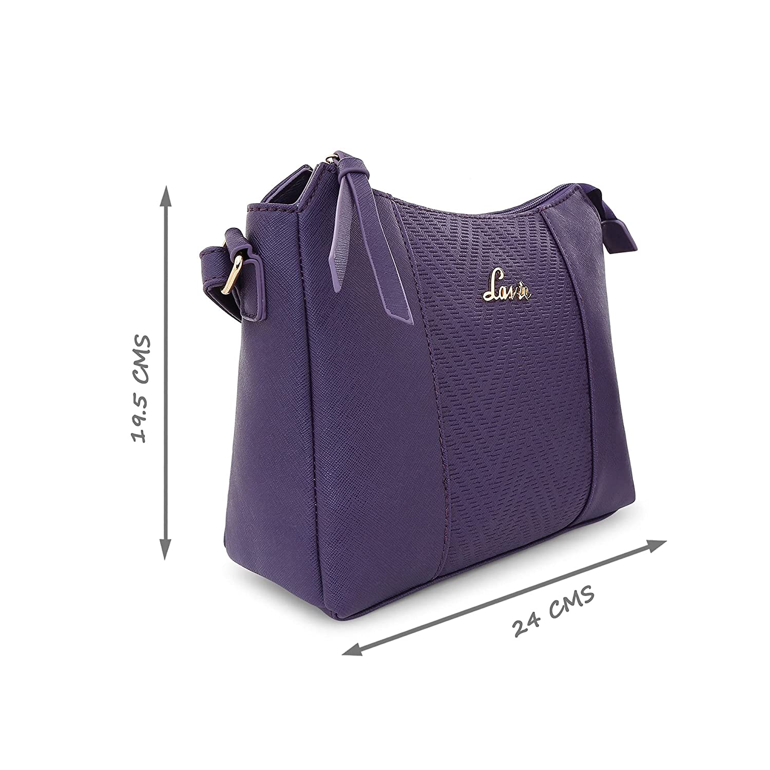 • Purple sling bag with herringbone texture on the front panel