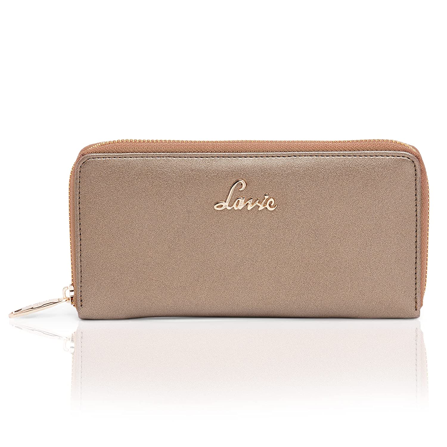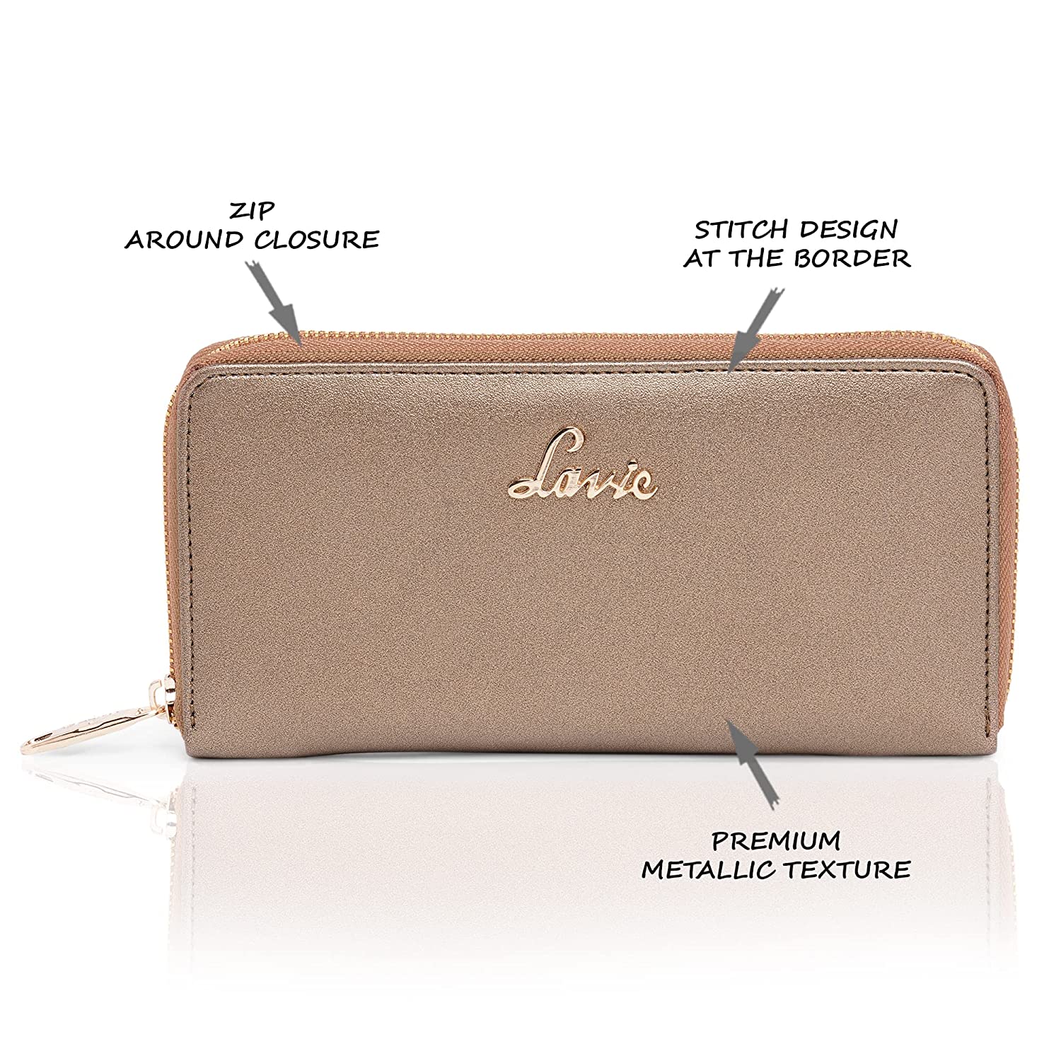 • Indulge yourself with a fashion accessory unlike anything you've ever had before A zip around wallet by Lavie flaunts a luxurious soft synthetic leather finish, metallic label treatment.