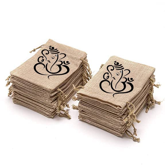 Jute Potli Pouch with Ganesh print (Set of 15)