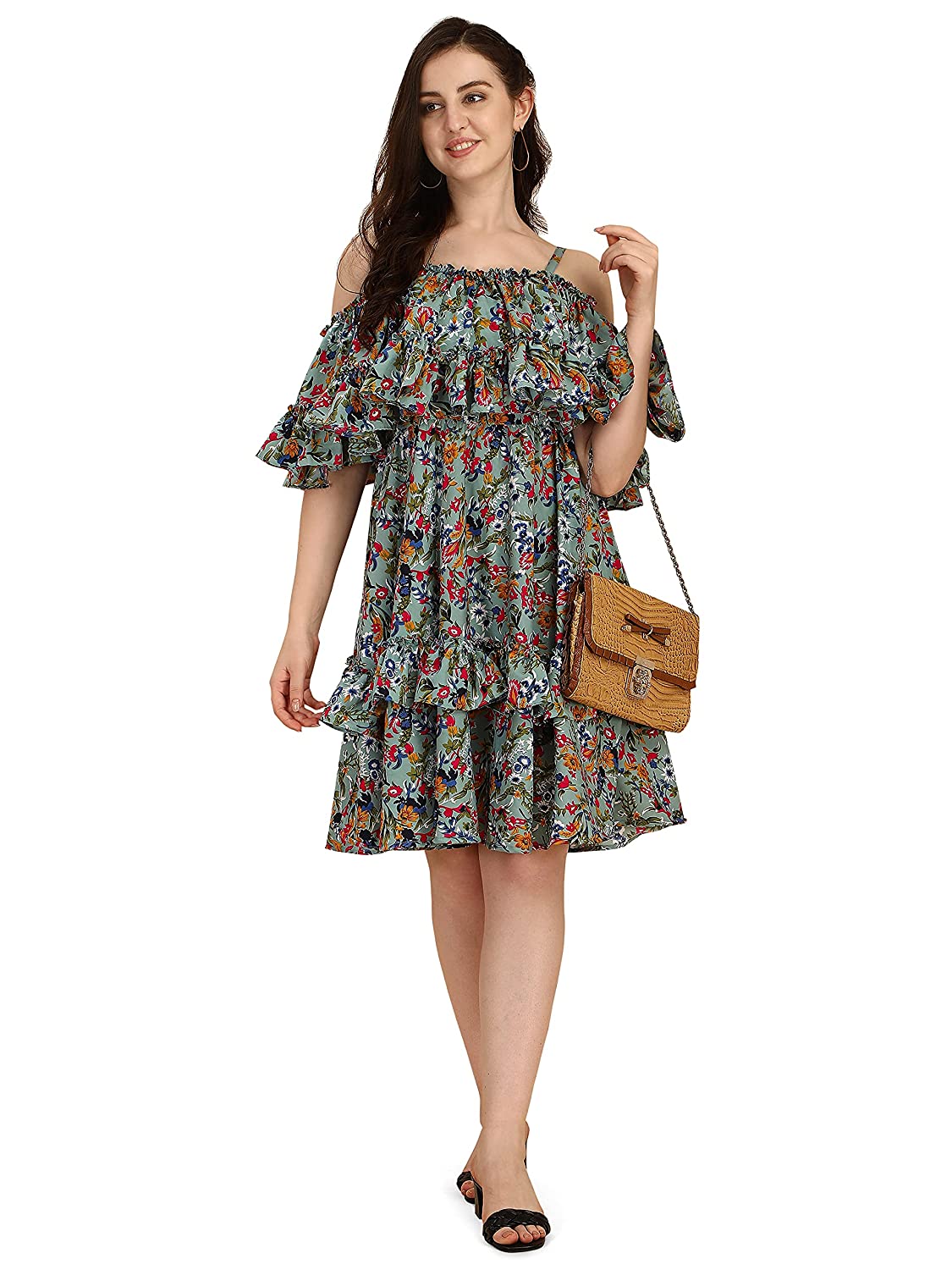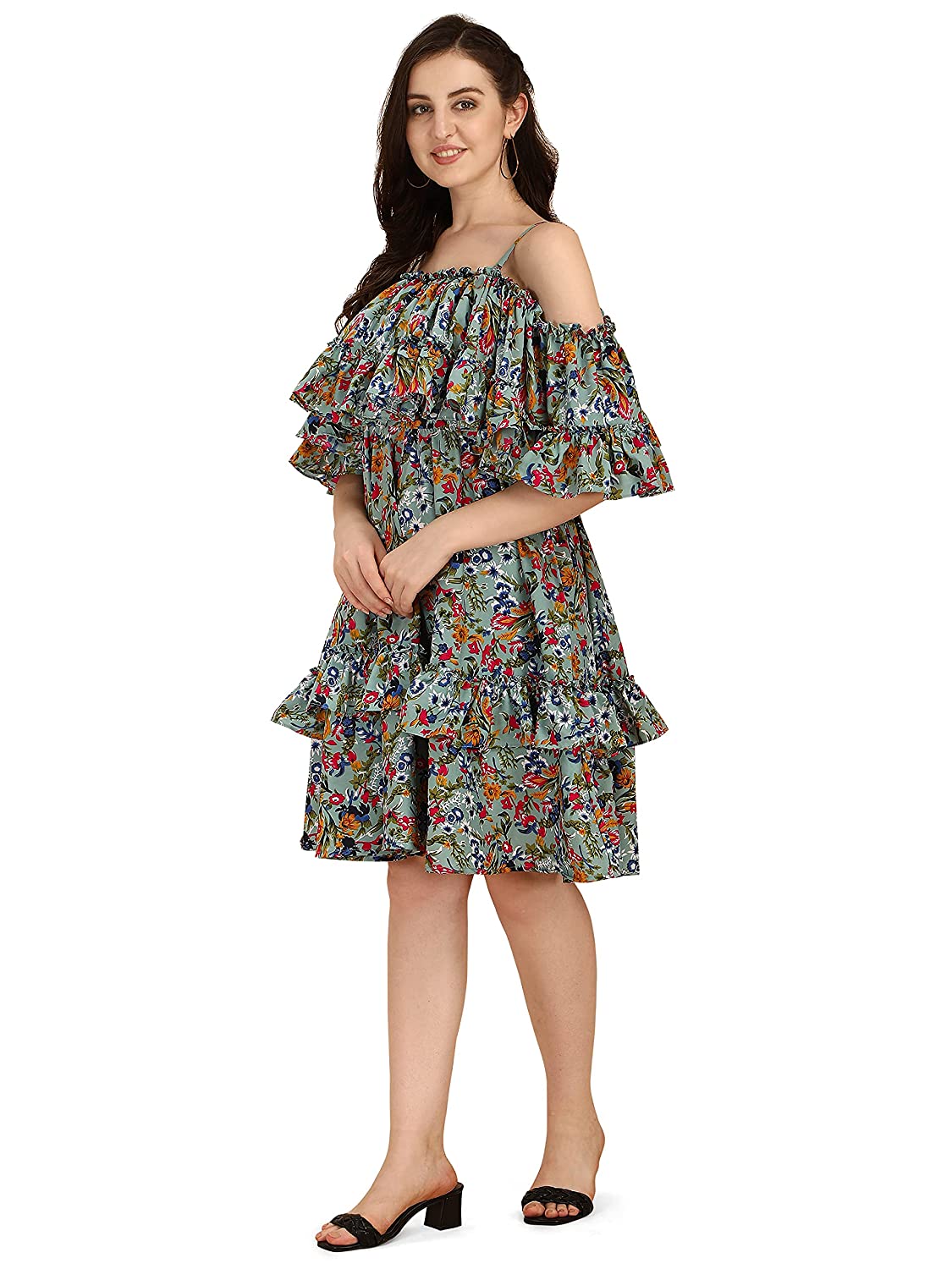 - Off shoulder dress with ruffle detail both on neck, cape and hemline