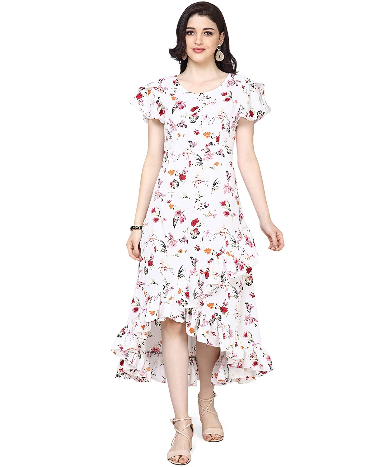 • High-low A-line dress with ruffled hem in wrap-up style. U-neck, butterfly sleeves.