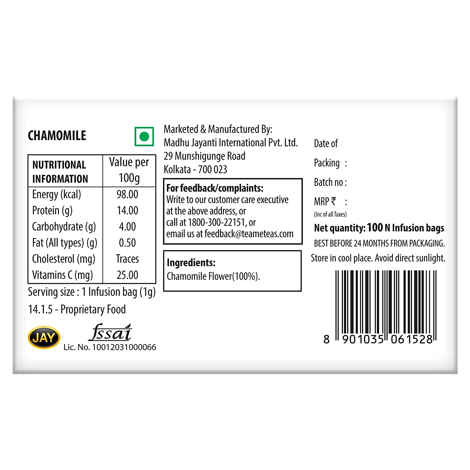 • INFUSION TEA PROFILE: Our Chamomile product does not contain any tea, i.e it is 100?ffeine free and it may help in good sleep. Some other may contain green tea in chamomile and hence is not caffeine free, which may hinder good sleep. Our infusion has a certain floral character owing to the great quality Chamomile sourced from amongst the best estates.