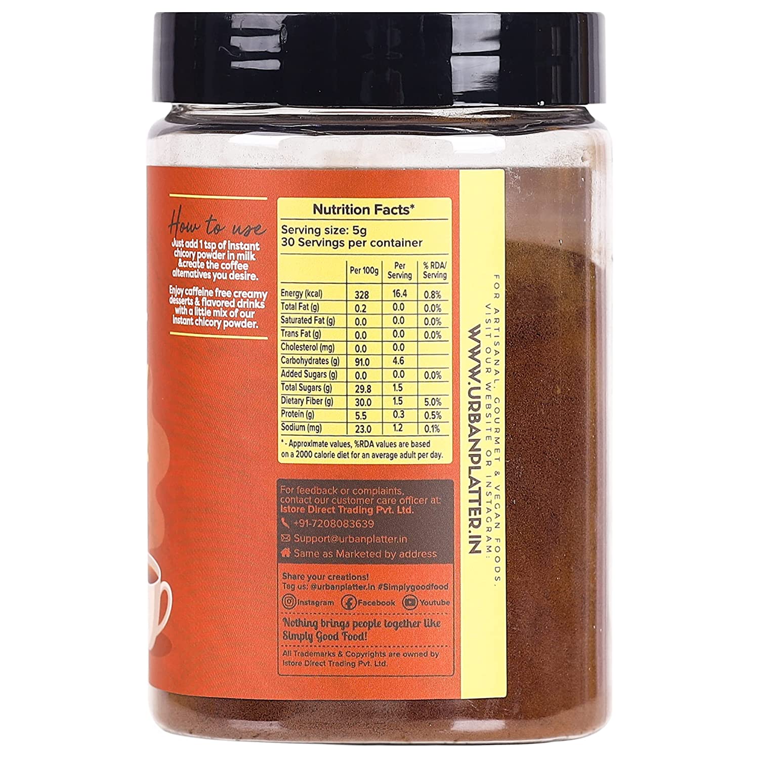 • CAFFEINE FREE : Get the rich coffee-like taste, satisfaction and energy without any bitterness or caffeine dependency with Urban Platterâ€s Instant Chicory Powder.