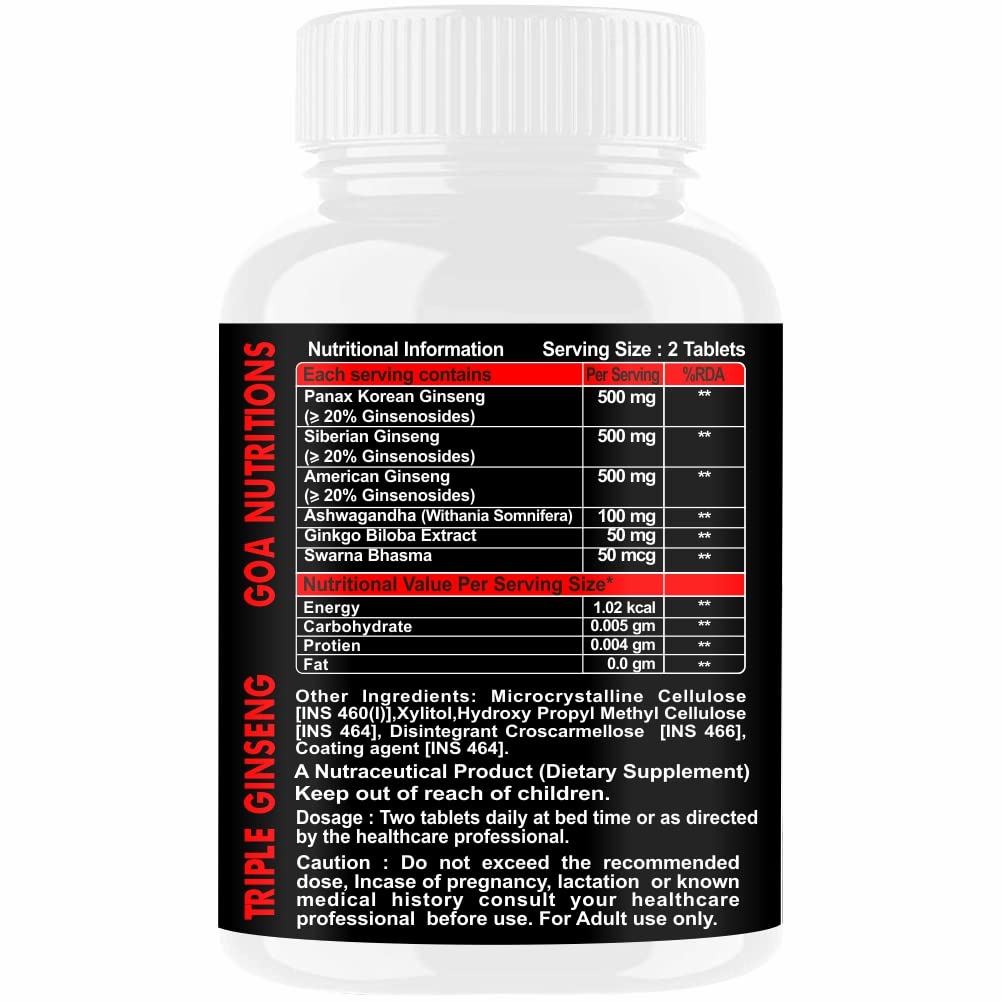 • ONLY GOODNESS, NO JUNK: Being advanced formulation, Free from Sugar, Talc, Preservatives, Gluten, Allergen. Goa Nutrition Triple Ginseng Tablets is a 3rd party lab-tested product that is manufactured in a GMP & ISO certified facility using premium and high potency ingredients to provide the best results. It is a Non-GMO product and doesn't have any blinders or artificial ingredients. (unflavored Tablet). unlike capsule it is easily digestible