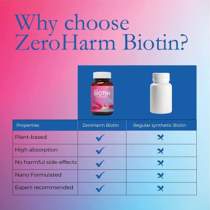 • ✔ 100?SORPTION WITH A LOWER DOSAGE: ZeroHarm Nano Biotin contains nano-formulated Sesbania Grandiflora extracts. Nanotechnology enables faster passage and completes absorption into the bloodstream. This results in goodness reaching right where it should.