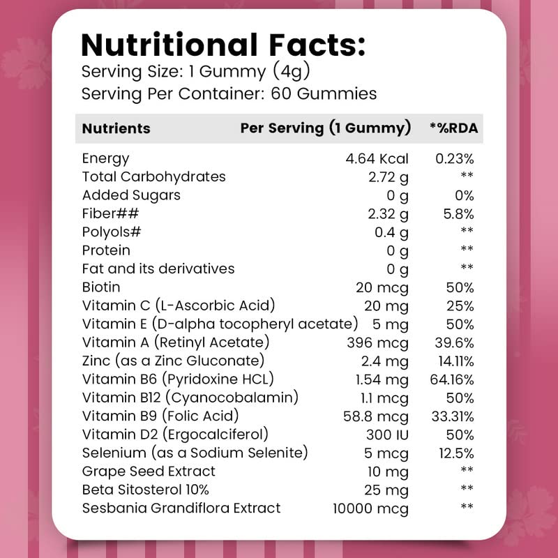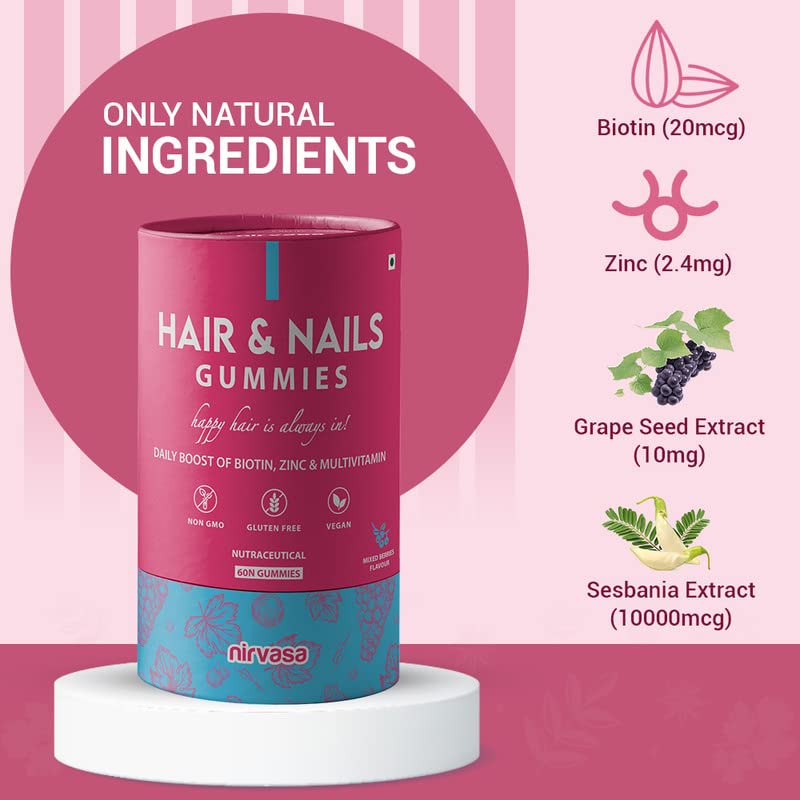 • CERTIFIED SUPPORT: Nirvasa Mixed Berry Flavoured Hair & Nail Gummy is a well-researched formulation that can reduce hair loss, improve nail health, and bring a perfect glow to your skin. All this is done naturally, as our Hair & Nail gummies are gluten-free, sugar-free, and vegetarian. Moreover, the supplement is manufactured under ISO and WHO approved conditions.
