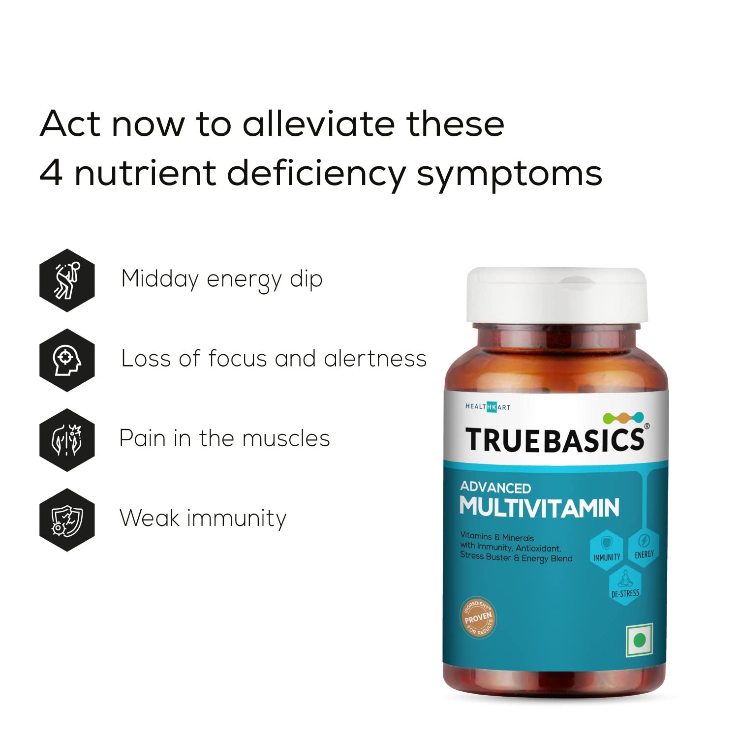 • A SCIENTIFICALLY FORMULATED MULTIVITAMIN WITH 3 POWERFUL BLENDS: TrueBasics Advanced Multivitamin is a daily multivitamin enriched with 23 essential nutrients & clinically researched ingredients that help boost energy levels, enhance immunity, cognition, reduce stress, and support sleep. It is scientifically formulated with three powerful blends: Enhanced Energy Blend, Immunity & Anti-Oxidant Blend, & Stress Buster Blend which together help you achieve more from your day