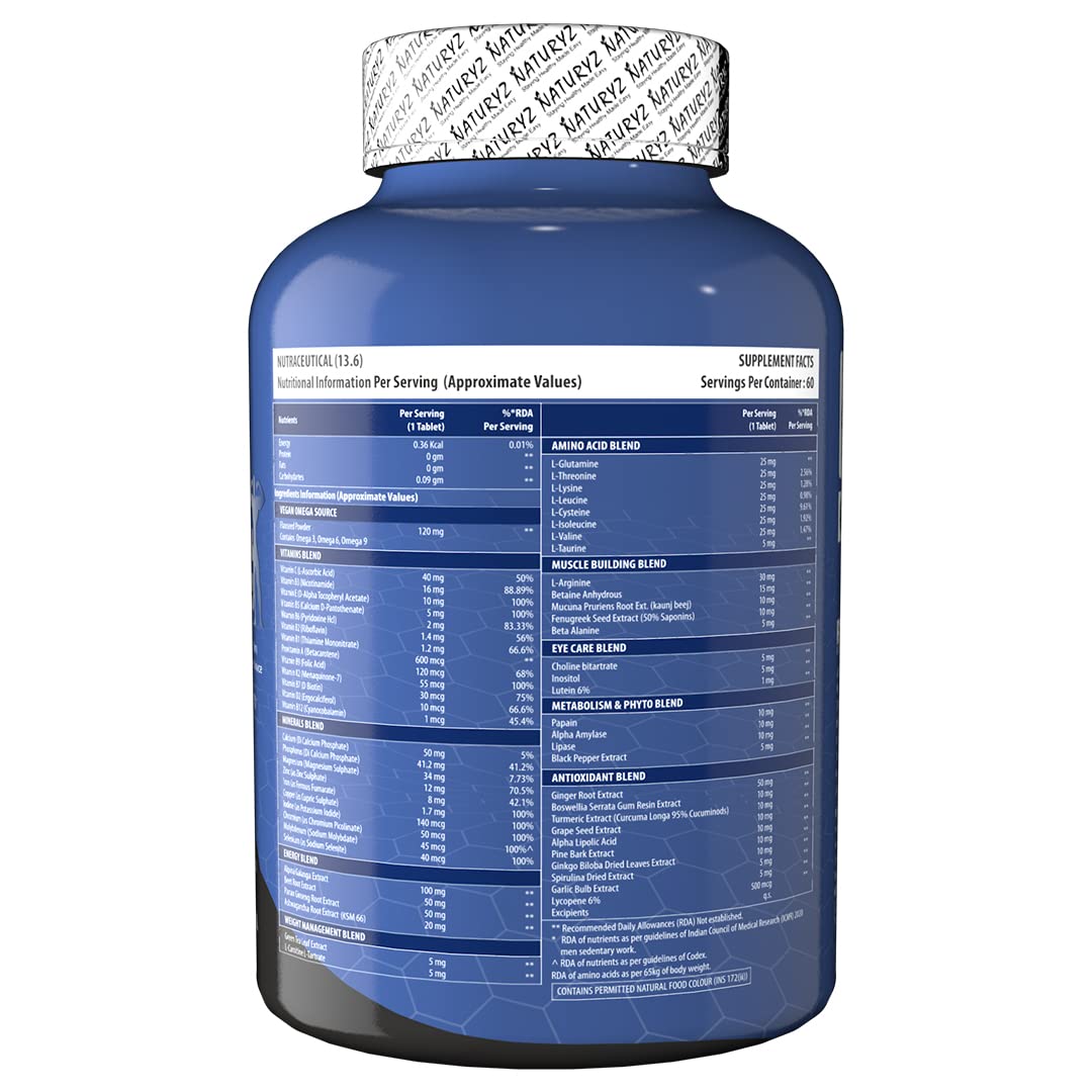 Daily Multivitamin Men 18+ with Highest 60 Nutrients (Vitamins, Minerals, Amino acids, Enzymes, Antioxidants, Herbal Extracts with Omega 3) and 11 Performance Blends for Muscle growth, Strength & Immunity- 60 Tablets