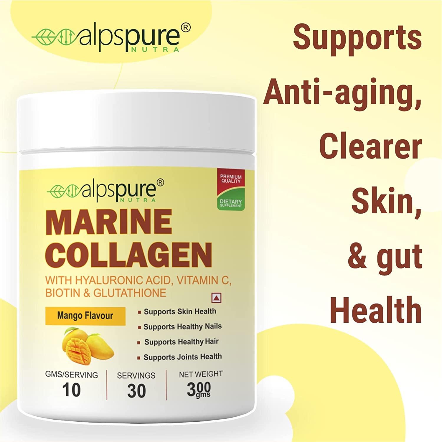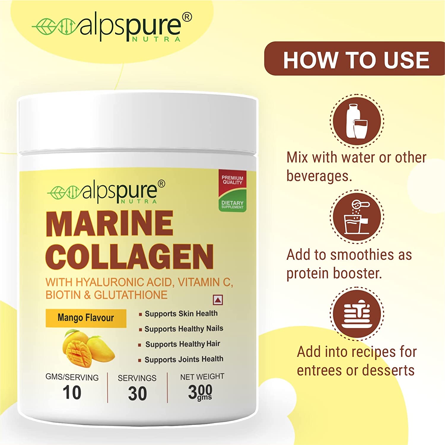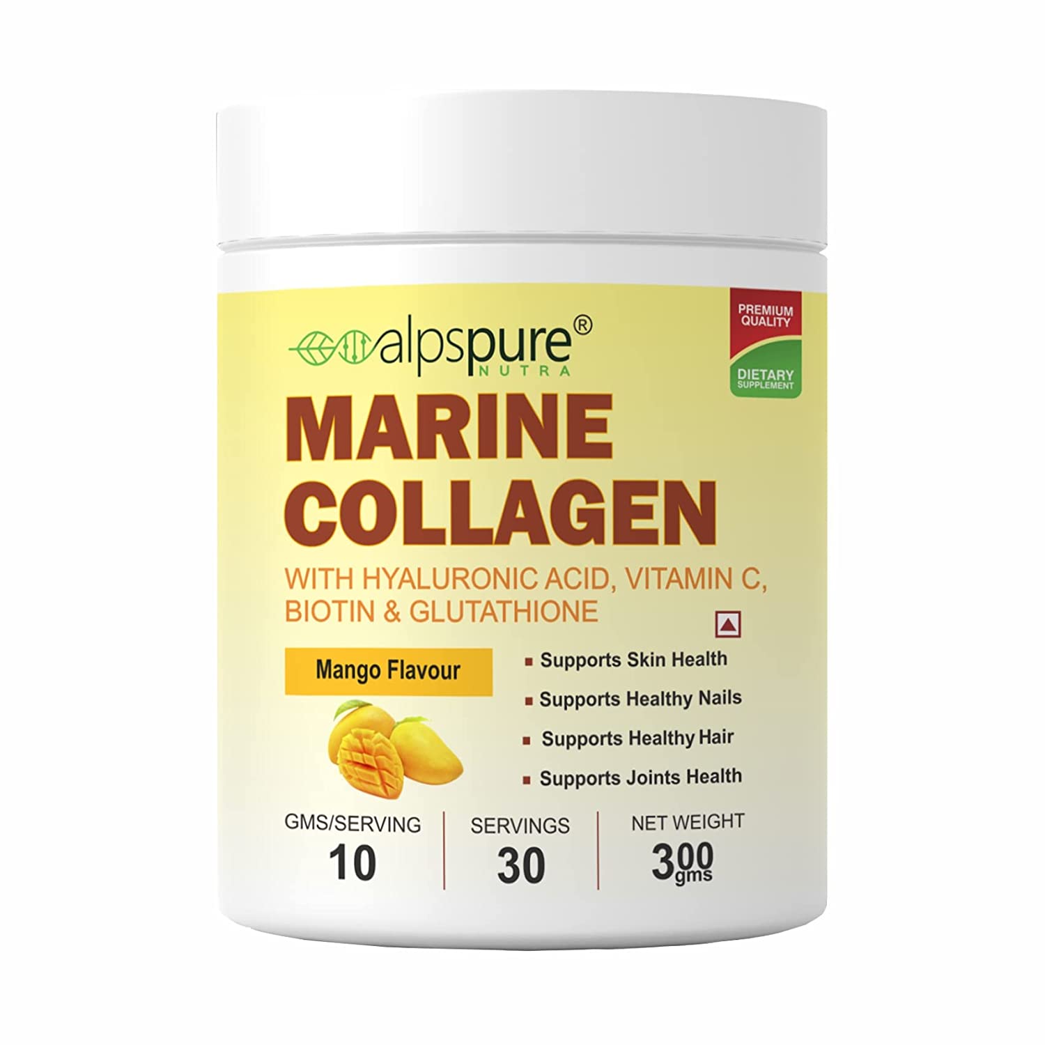 - Package Content: 1 jar of Alpspure Nutra Marine Collagen Supplement : Item Form:-Powder : Quantity: 300 gm Flavour :-Mango