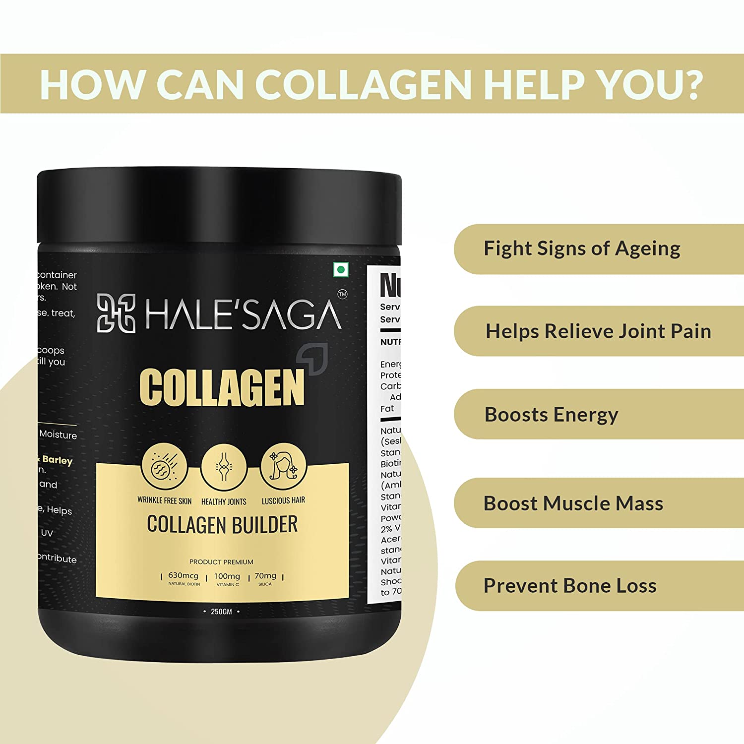 - Halesaga collagen builder is certified by U.S.FDA, FSSAI, ISO, HACCP, WHO-GMP, HALAL.