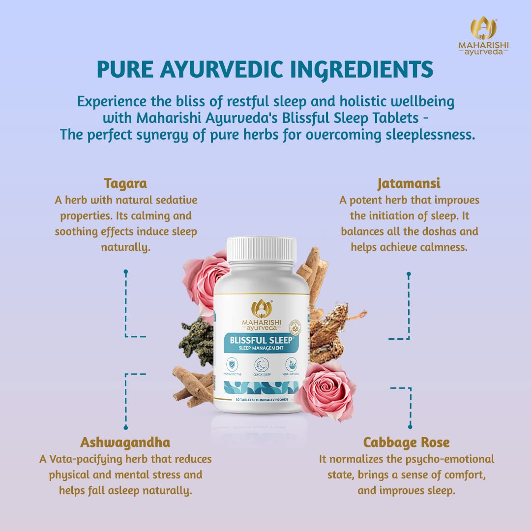• POWERFUL AYURVEDIC INGREDIENTS: Blissful Sleep Supplements contain a powerful blend of Ayurvedic ingredients that are effective in pacifying Vata, including Ashwagandha, Cabbage Rose, Jatamansi, and Tagara. These ingredients work in harmony to address the body's needs holistically, promoting repair, restoration, and revitalization. Regular consumption of this product can help reduce stress, boost immunity, and enhance mood, ultimately leading to improved overall well-being.