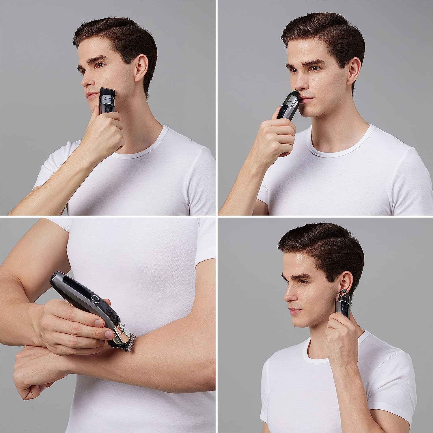 • Cordless body grooming kit with beard trimmer, ear and nose hair trimmer and attachments for grooming body hair